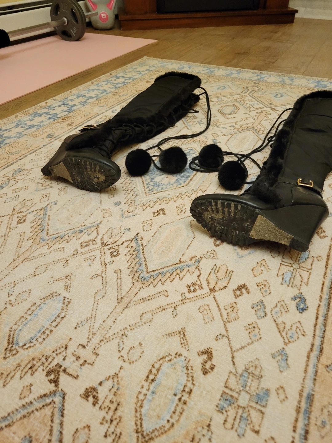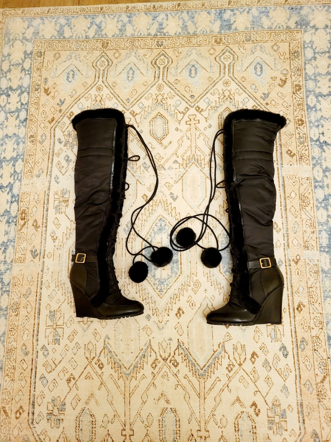 Selling a pair of stylish black over-the-knee wedge boots! They feature a unique design with fur trim and pom-pom details. Perfect for adding a touch of flair to your winter wardrobe. Has anti slip on bottom of feet for extra protection. Very comfy to walk in. Selling due to closet clean out haul. Need to reduce items.