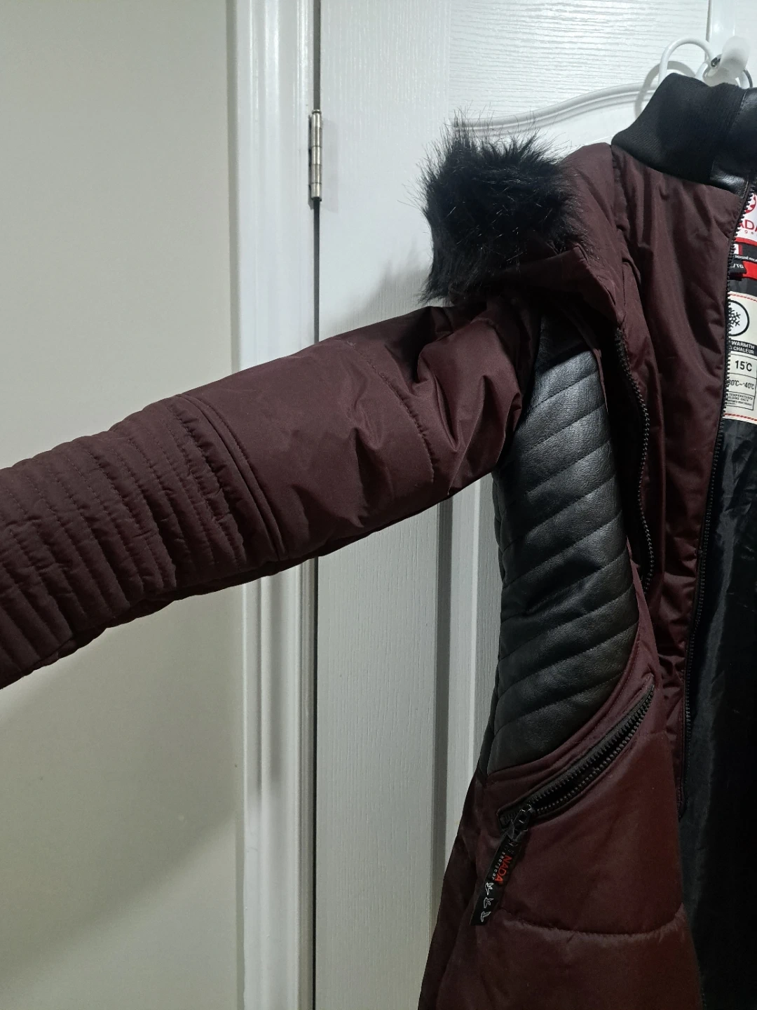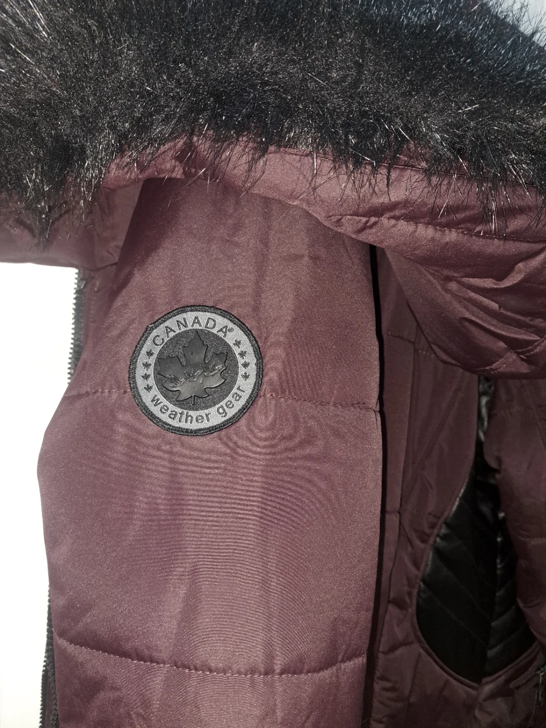 Selling a Canada Weather Gear puffer jacket in size XL. It's designed in Canada and maintains warmth even in low activity at 15°C. Recommended for temperatures between -30°C to -40°C. It is a burgundy colour with black detailing.
