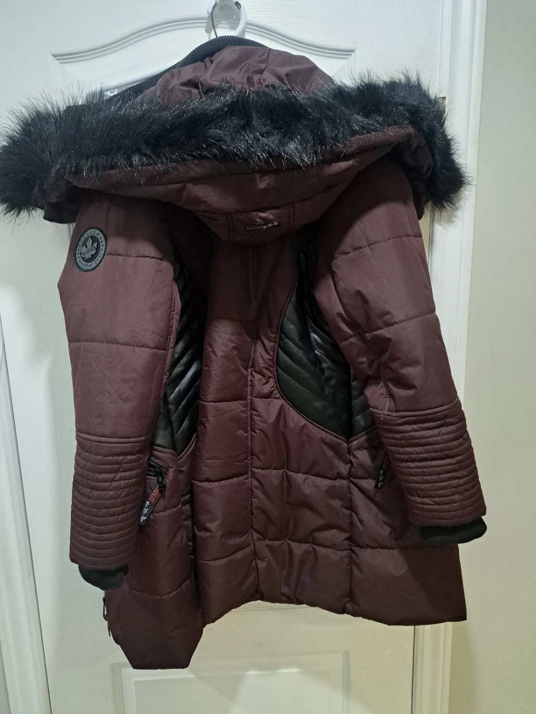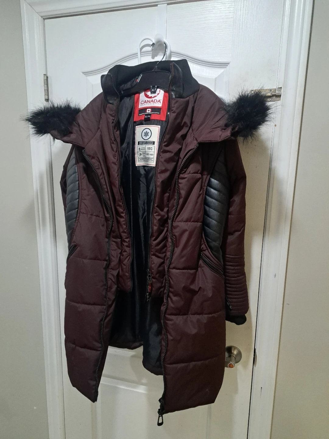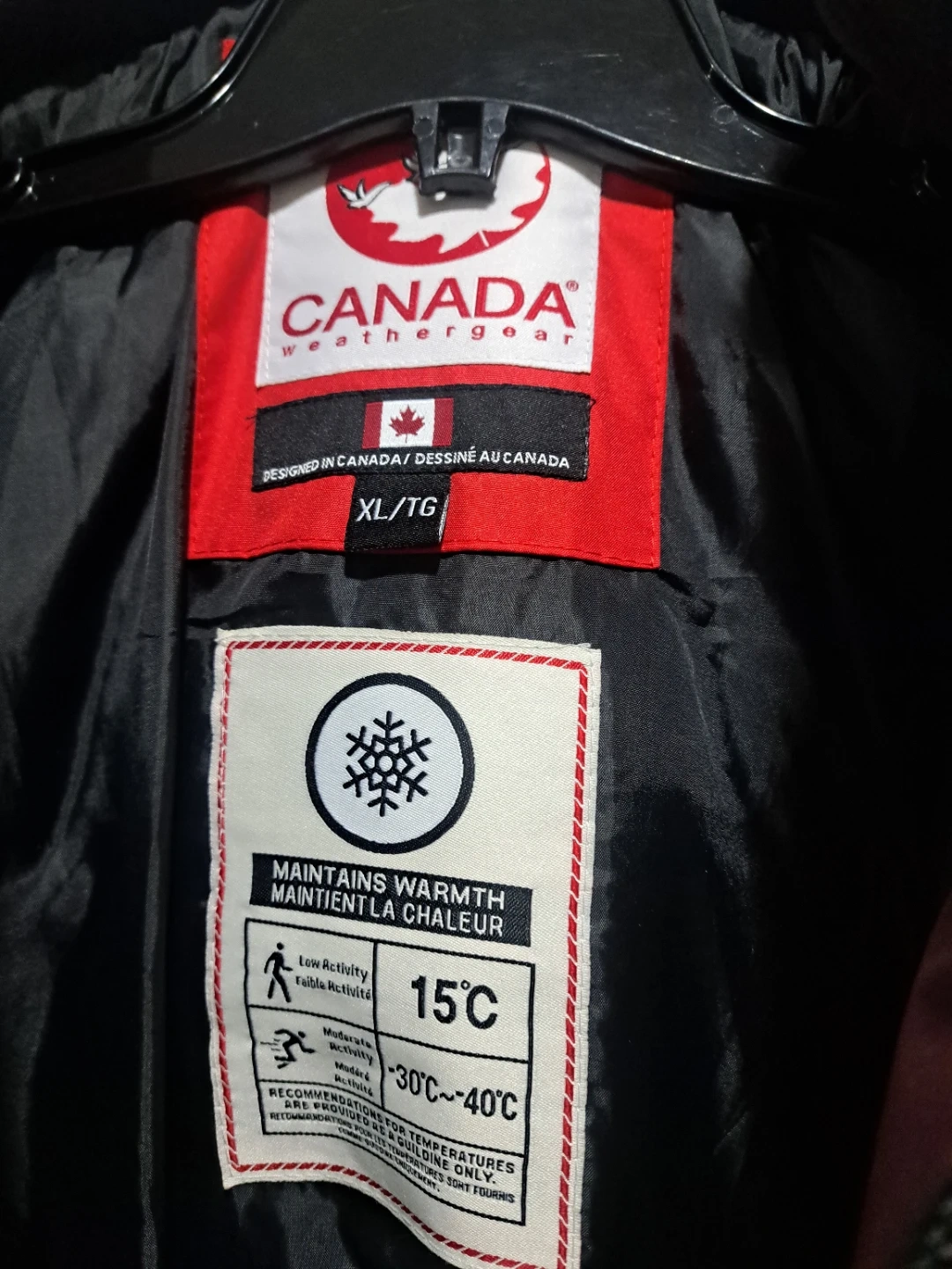 Selling a Canada Weather Gear puffer jacket in size XL. It's designed in Canada and maintains warmth even in low activity at 15°C. Recommended for temperatures between -30°C to -40°C. It is a burgundy colour with black detailing.