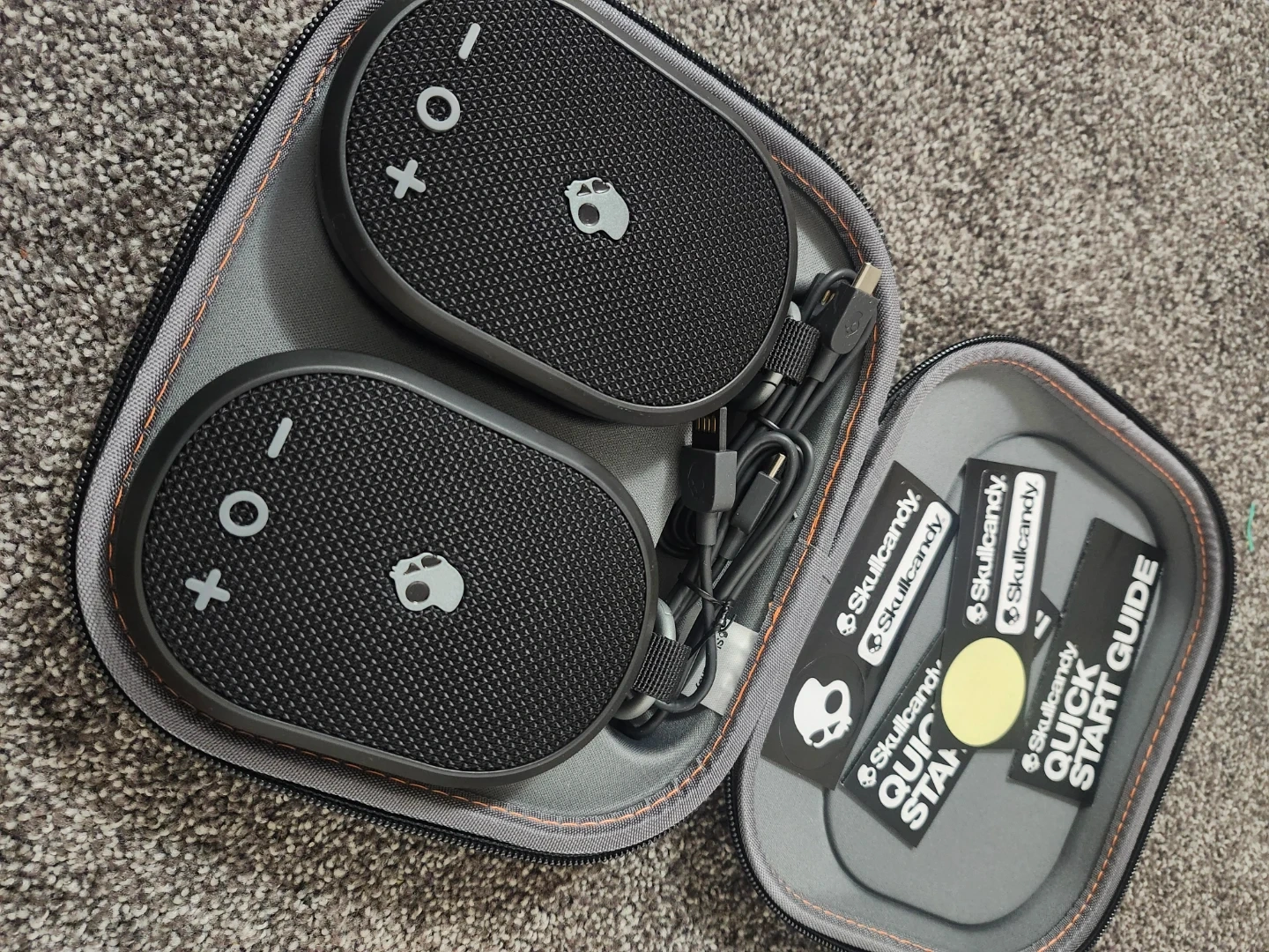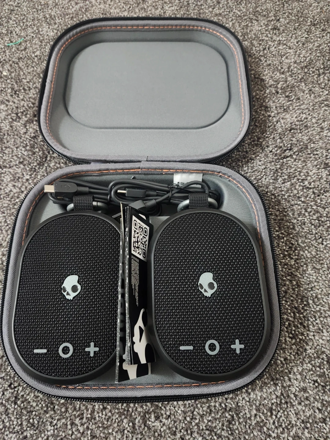 Selling a brand new Skullcandy Terrain wireless Bluetooth speaker pair! It comes with the original box, stickers, quick start guide, and a charging cable. This portable speaker is perfect for on-the-go listening!