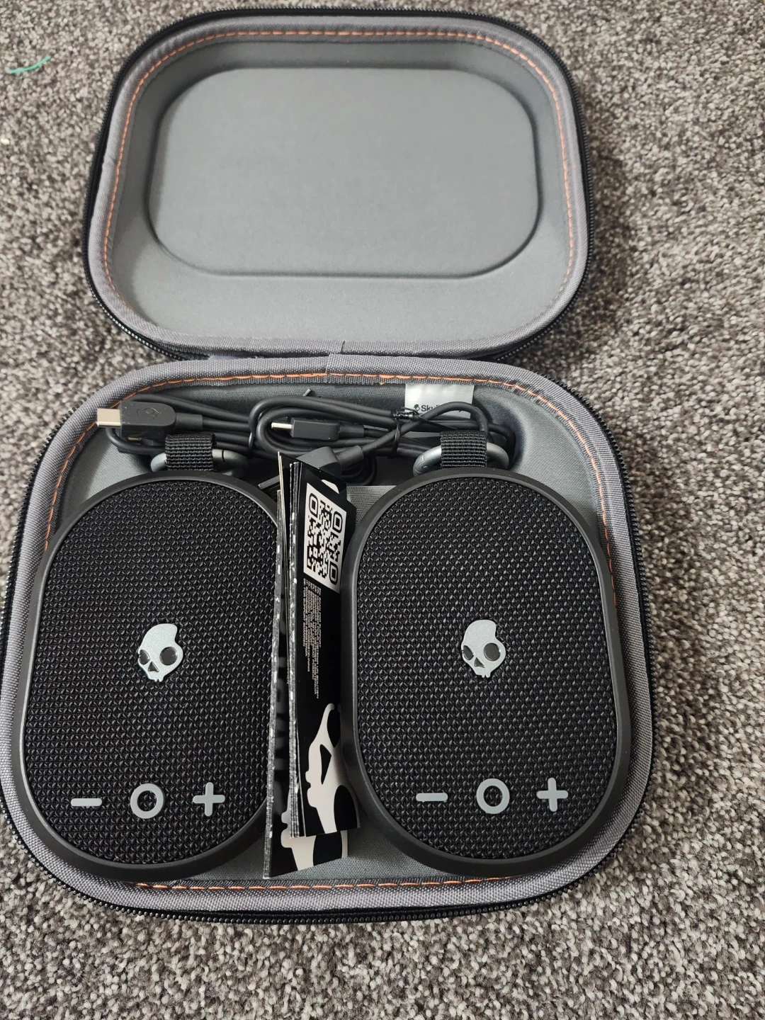 Selling a brand new Skullcandy Terrain wireless Bluetooth speaker pair! It comes with the original box, stickers, quick start guide, and a charging cable. This portable speaker is perfect for on-the-go listening!