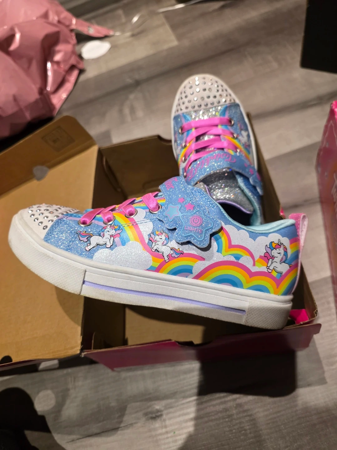 These adorable Skechers Twinkle Toes feature a cute unicorn and rainbow design! They light up, adding a fun touch to any outfit. They come with the original box