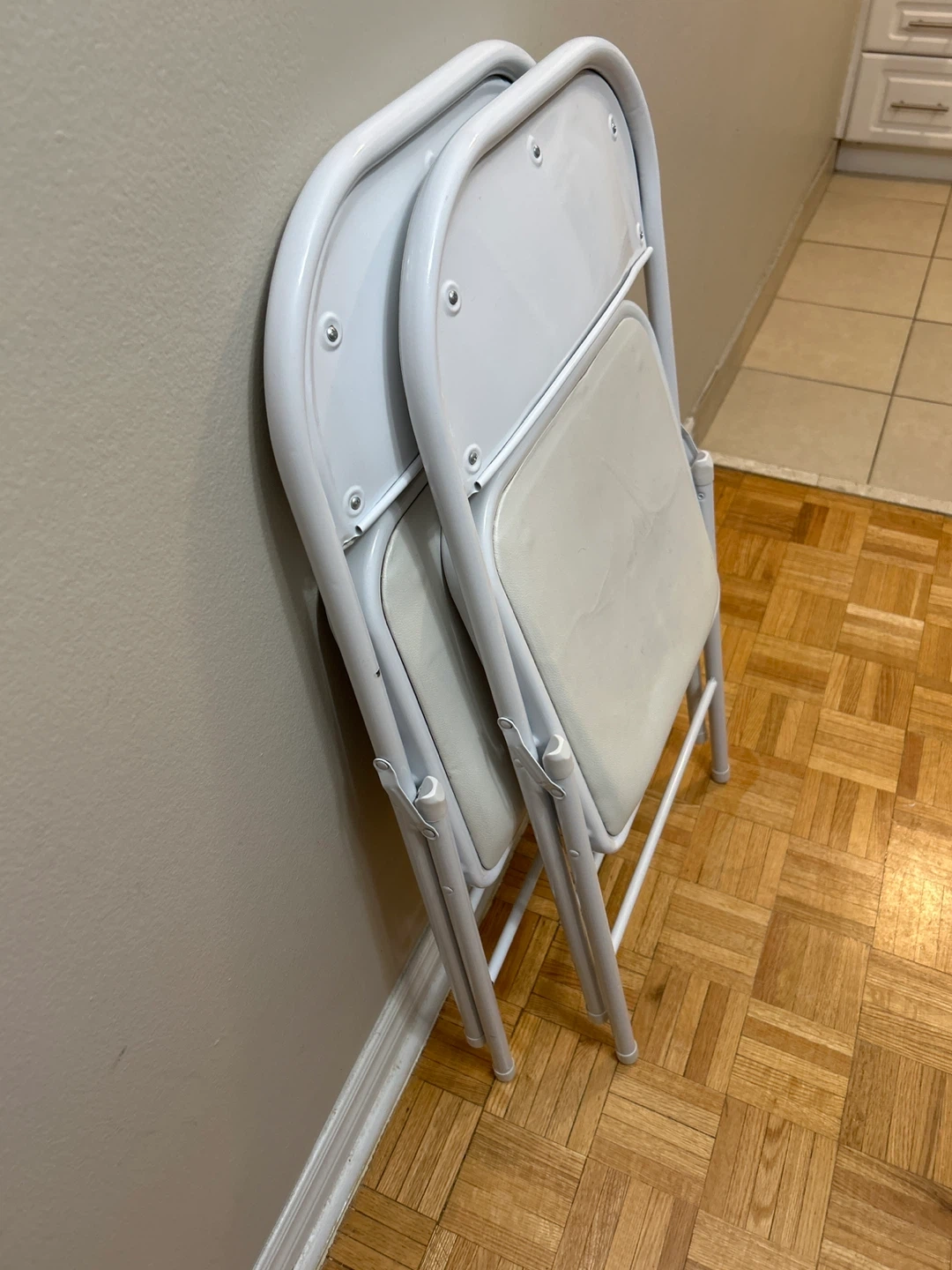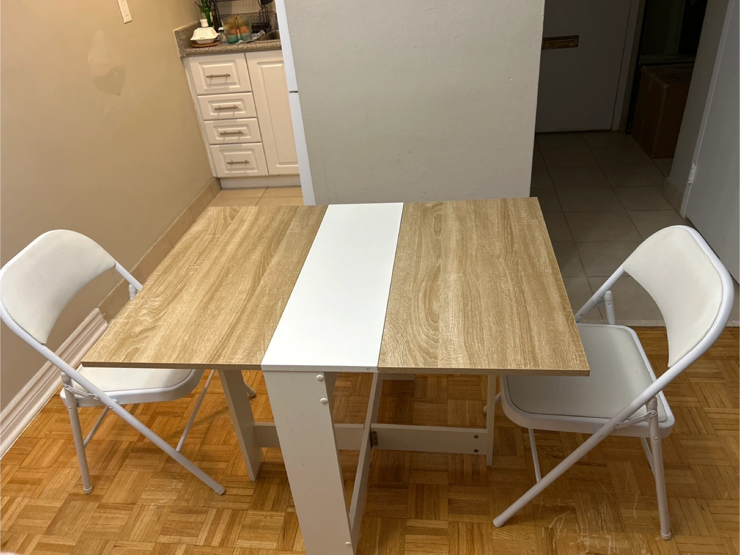 Selling a folding dining table with two white folding chairs. The table has a light wood-look top with a white centre strip and white legs. Great for small spaces!