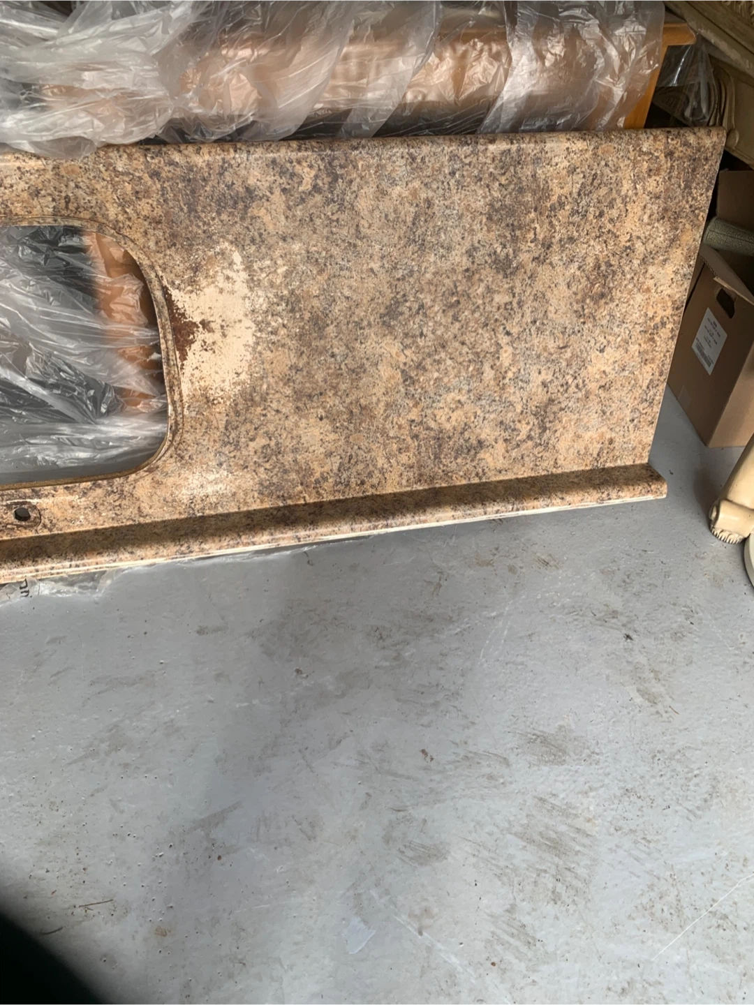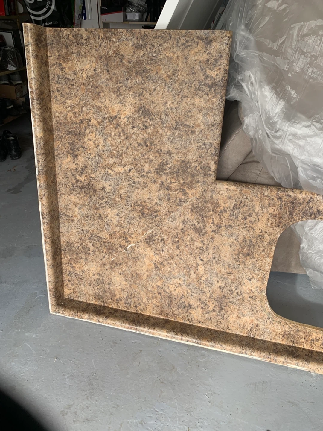 Selling a used countertop with a unique brown pattern. It has a sink cutout and some visible wear. Great for a DIY project or a budget-friendly renovation!