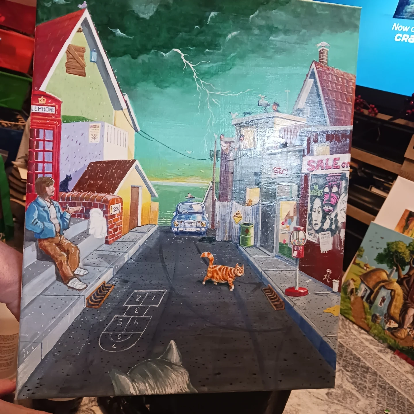 This is a unique street scene painting, perfect for adding a touch of character to any room! The painting features a detailed depiction of a street with buildings, a red telephone box, and even a cat. It's a great conversation starter and a lovely piece of art.