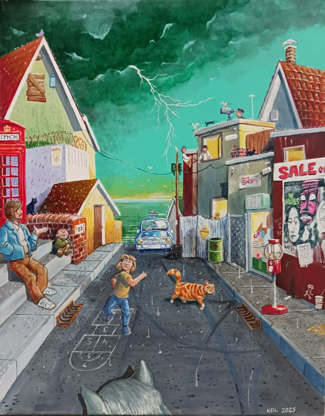 This is a unique street scene painting, perfect for adding a touch of character to any room! The painting features a detailed depiction of a street with buildings, a red telephone box, and even a cat. It's a great conversation starter and a lovely piece of art.