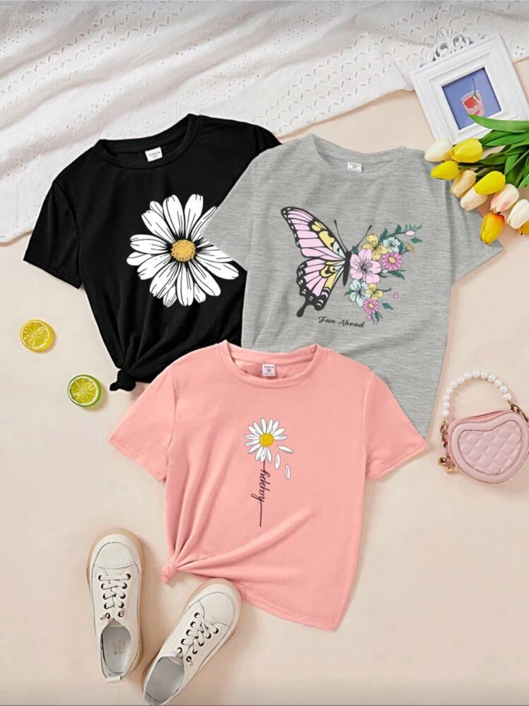 Selling a set of three graphic tees ! You'll get a black tee with a daisy, a gray tee with a butterfly and flowers, and a peach tee with a daisy design. All are in great condition and ready for a new home