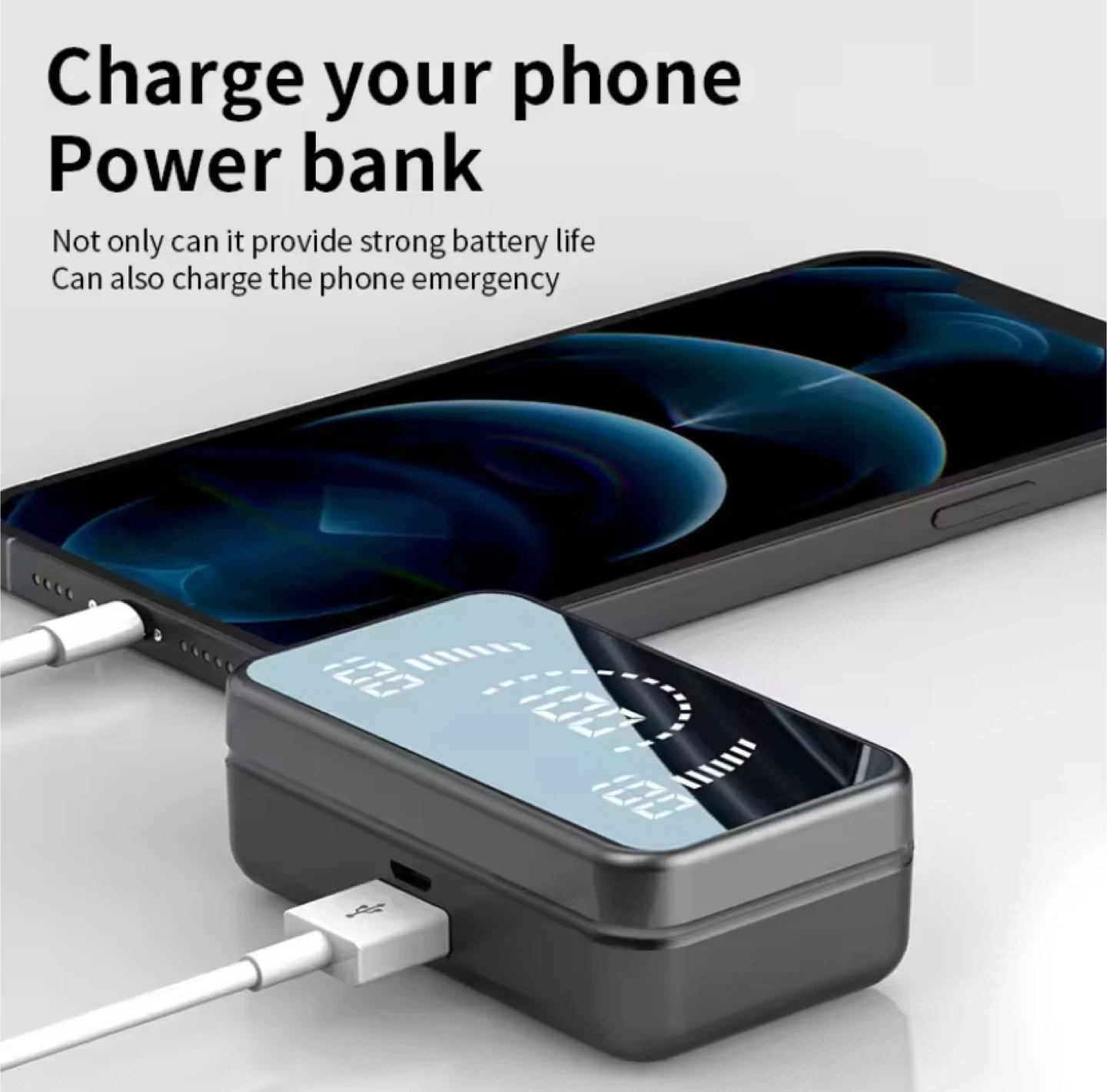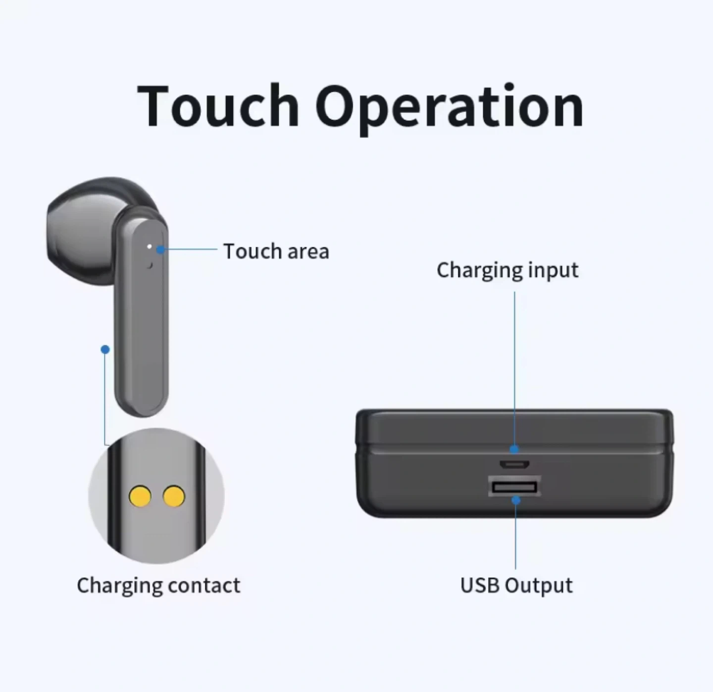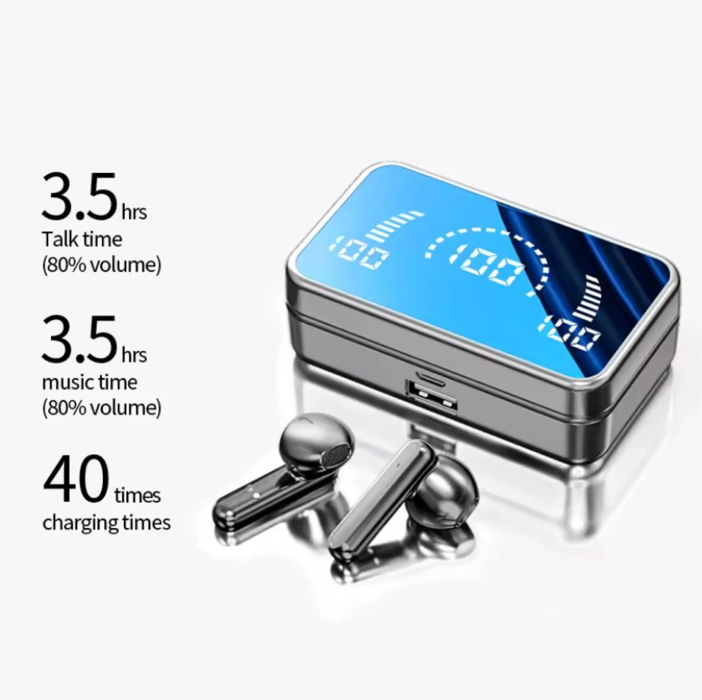These wireless Bluetooth earbuds come with a charging case that also functions as a power bank for your phone! Enjoy 3.5 hours of talk time or music time at 80% volume, and the case provides 40 times charging times. The charging case has a 2200mAh capacity and a USB output for charging your phone in emergencies. The earbuds feature touch operation for easy control.