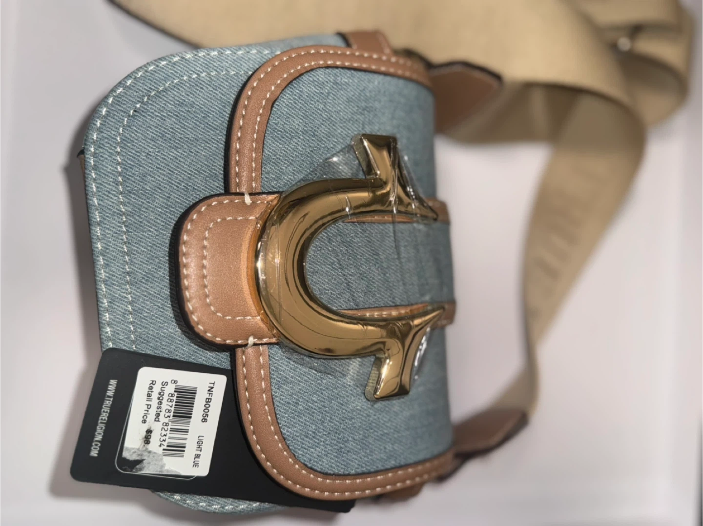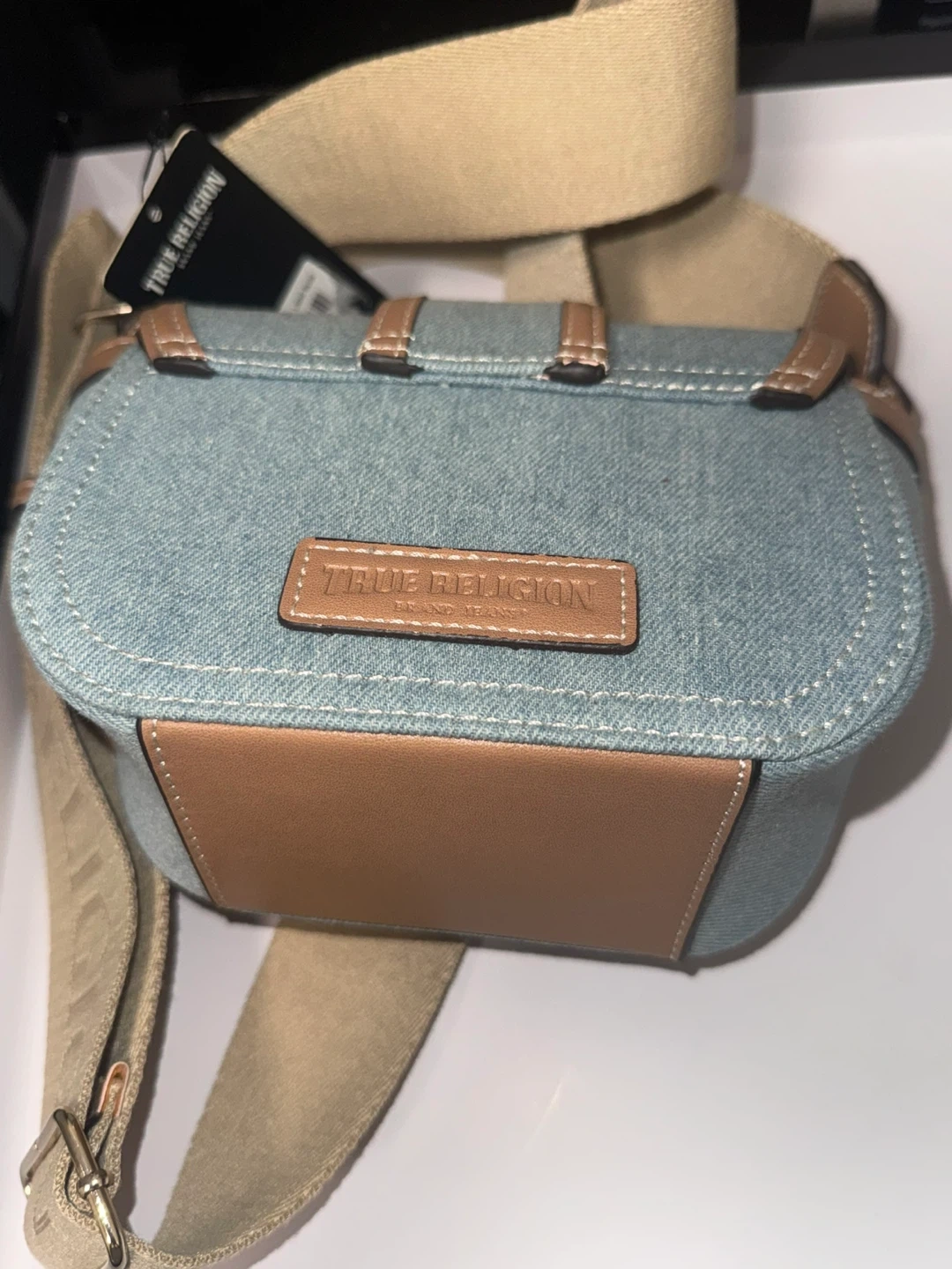 This is a True Religion denim crossbody bag in light blue. It's a stylish and practical accessory to complete any outfit. The bag features the brand's logo and has a comfortable strap for easy carrying