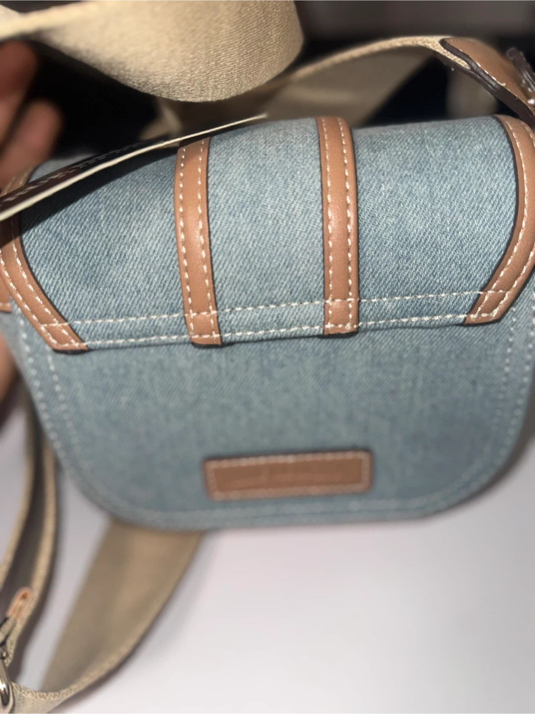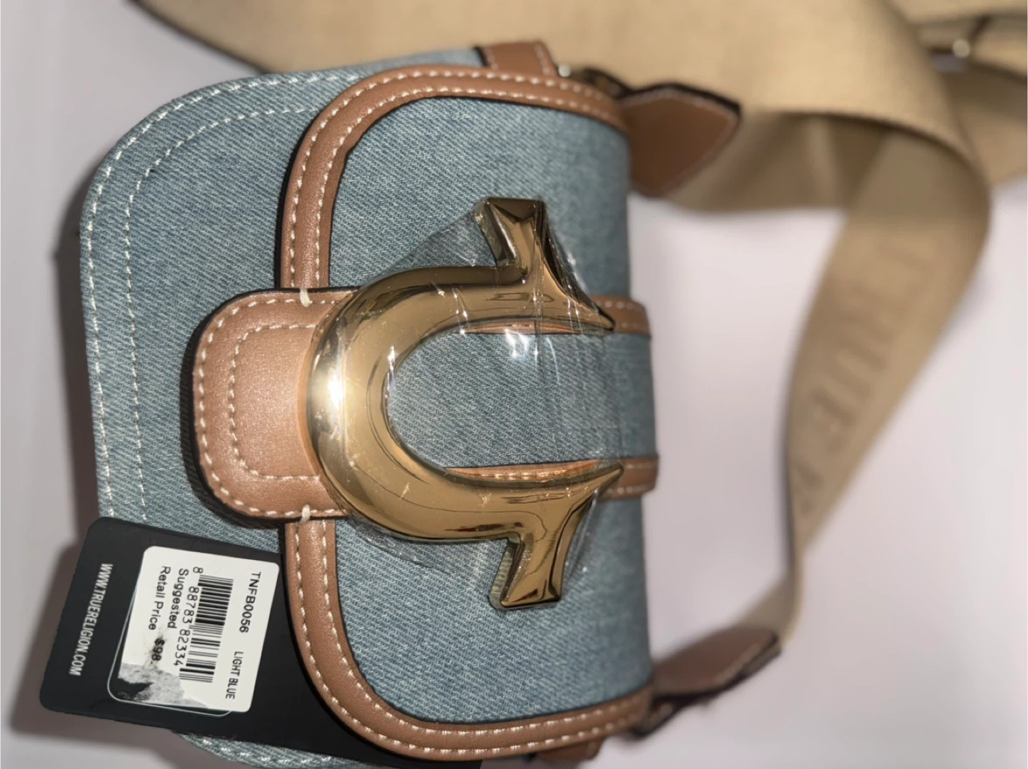 This is a True Religion denim crossbody bag in light blue. It's a stylish and practical accessory to complete any outfit. The bag features the brand's logo and has a comfortable strap for easy carrying