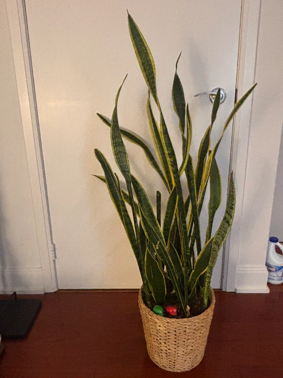 Giving away a healthy snake plant in a woven basket.
