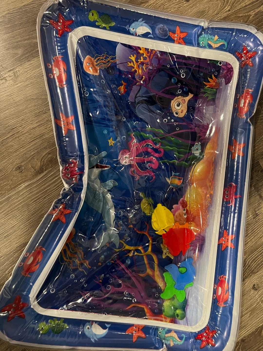 This inflatable water play mat is perfect for babies and toddlers! It's designed with a fun underwater theme, complete with colourful sea creatures and vibrant coral. This mat provides a safe and engaging sensory experience for your little one, encouraging tummy time and helping to develop motor skills