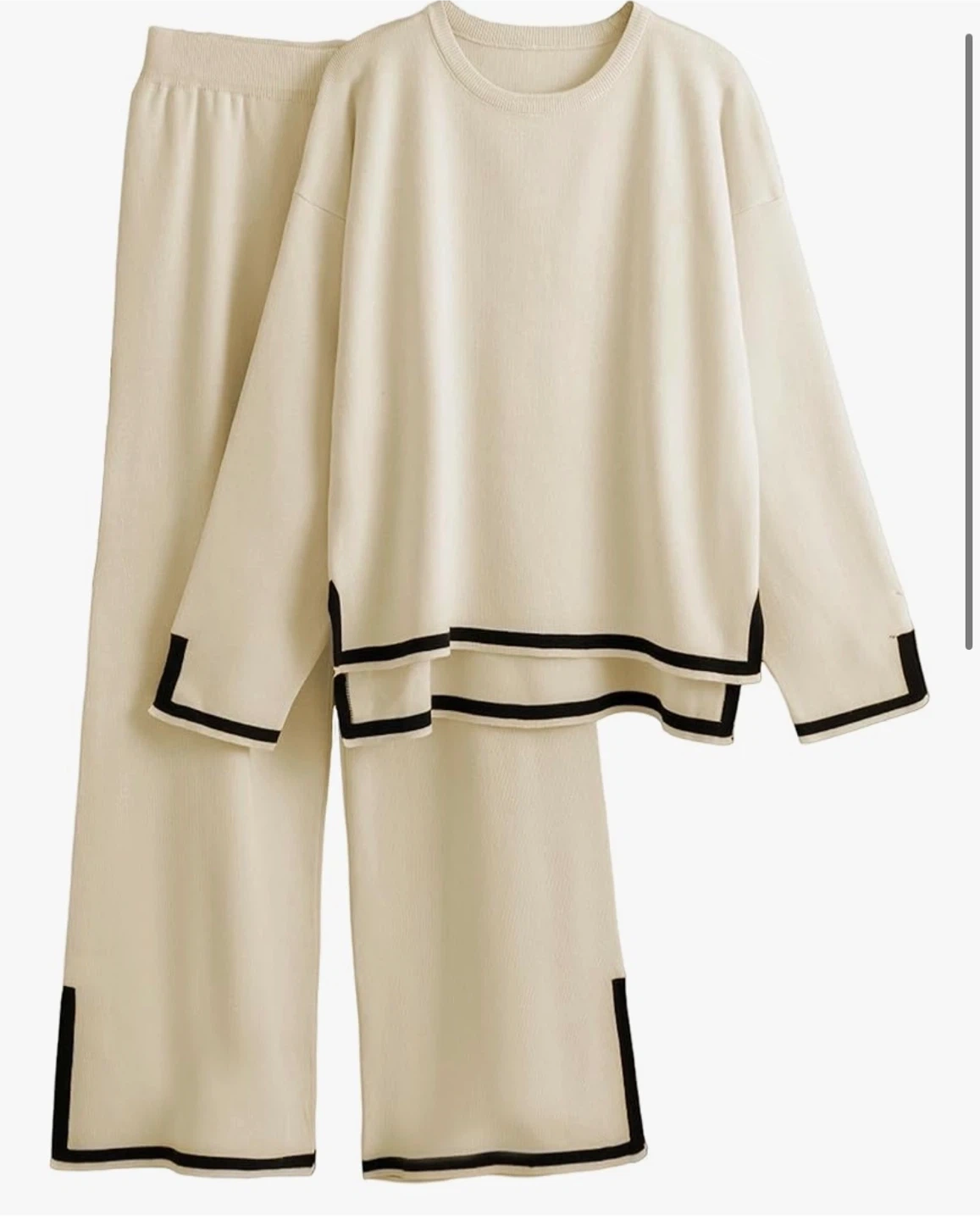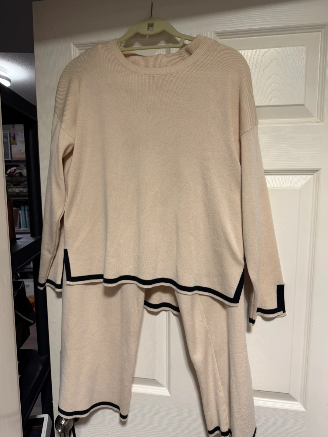 Selling a comfy beige lounge set! It features a relaxed fit top and matching pants, both with a stylish black trim. Perfect for lounging at home or running errands in comfort