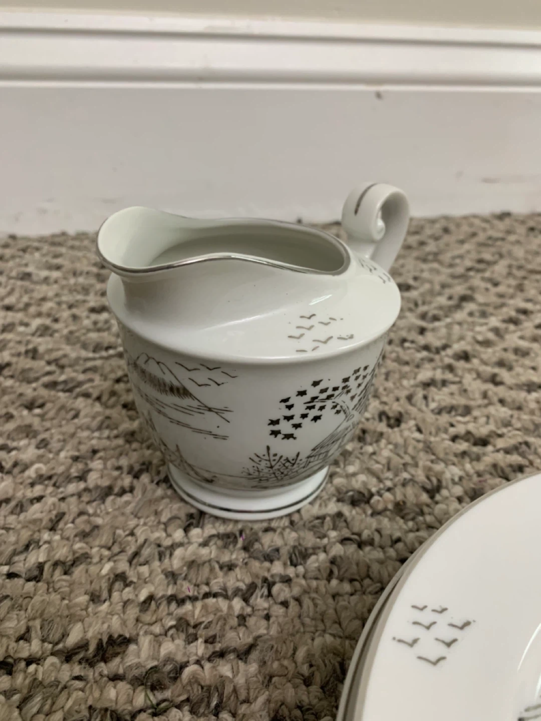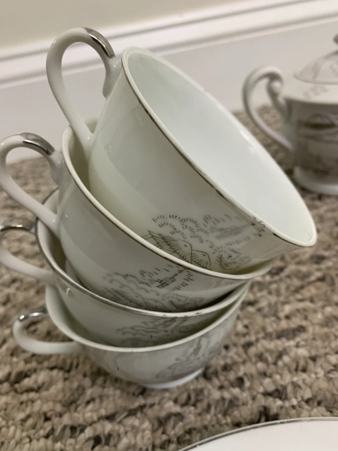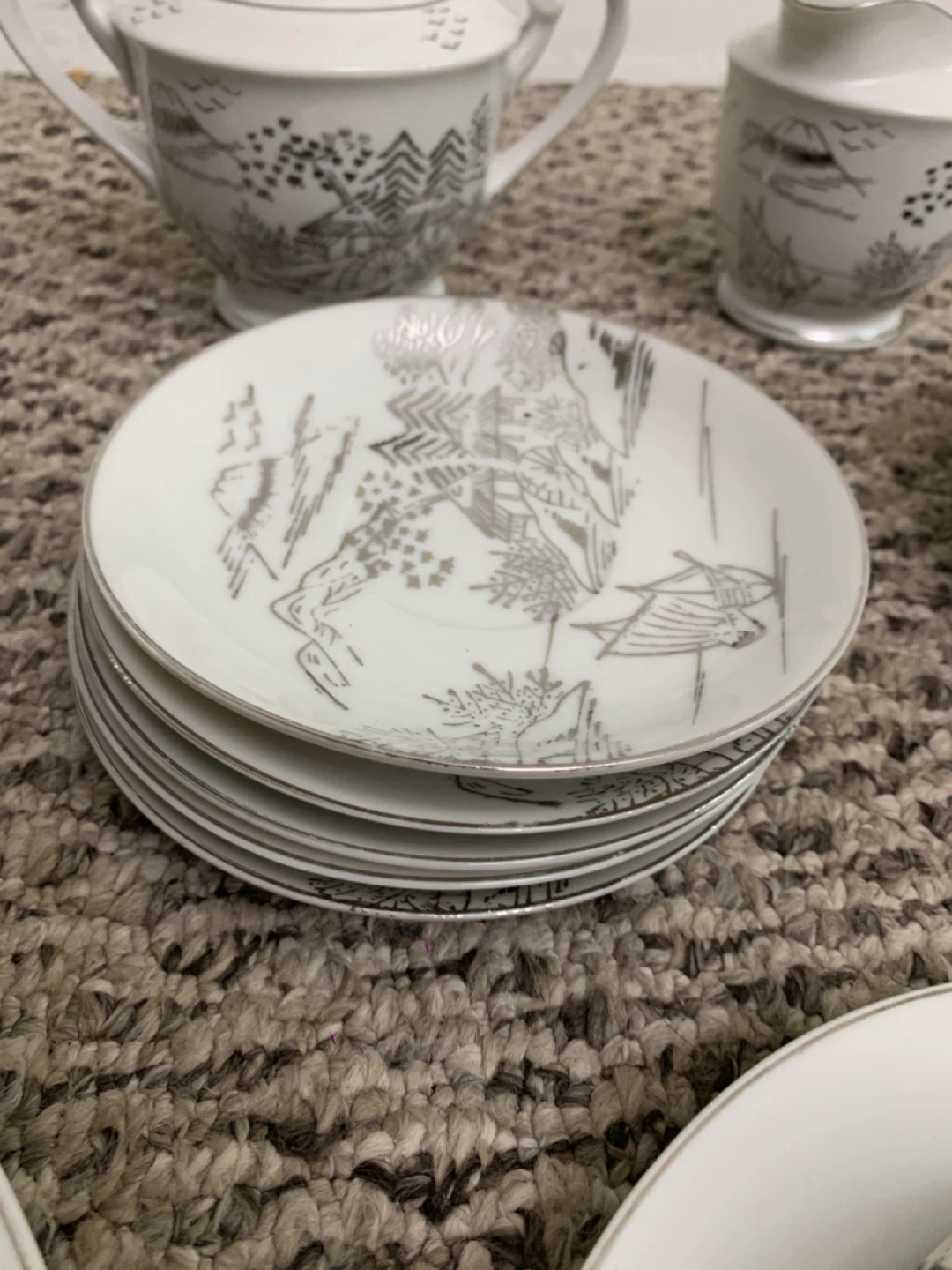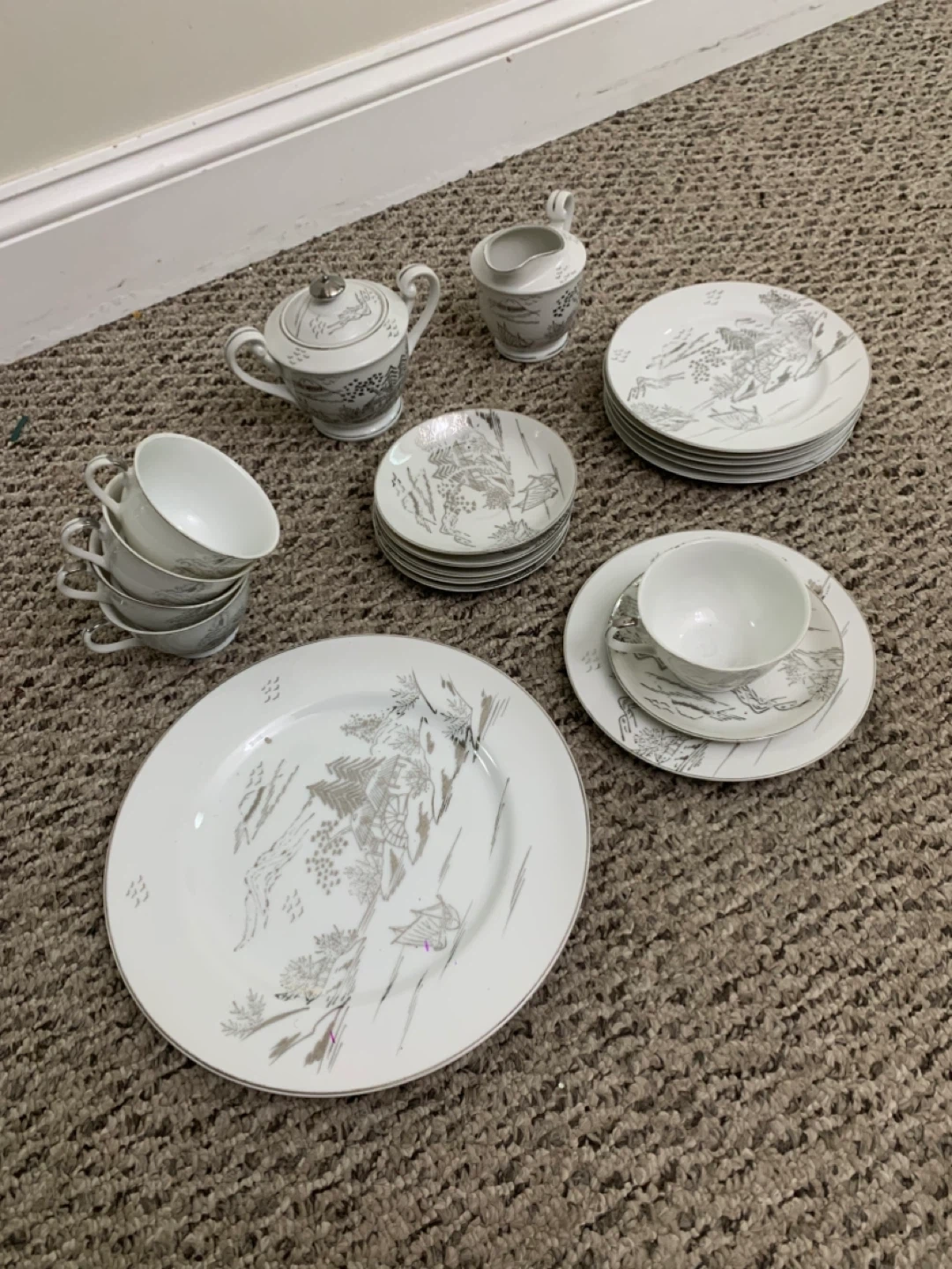 Selling a beautiful vintage white china tea set! It includes a teapot, creamer, sugar bowl, several cups and saucers, and plates. The set has a lovely, delicate design. Perfect for tea parties or adding a touch of elegance to your dining table