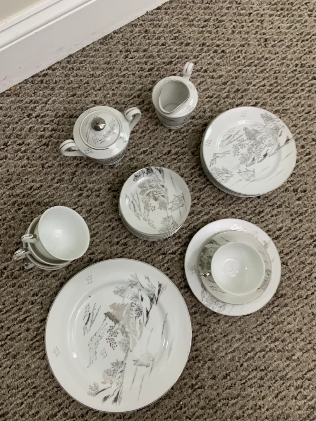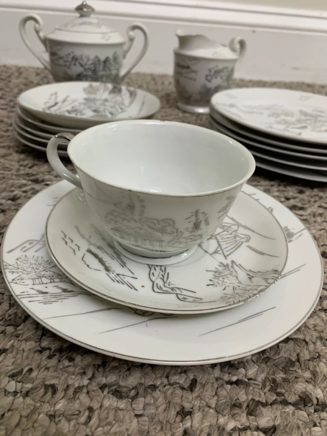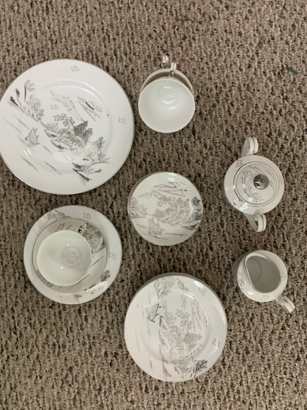 Selling a beautiful vintage white china tea set! It includes a teapot, creamer, sugar bowl, several cups and saucers, and plates. The set has a lovely, delicate design. Perfect for tea parties or adding a touch of elegance to your dining table