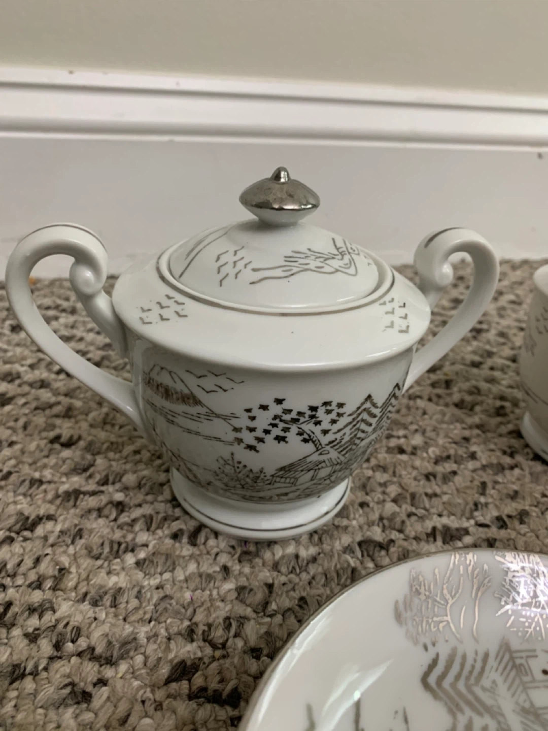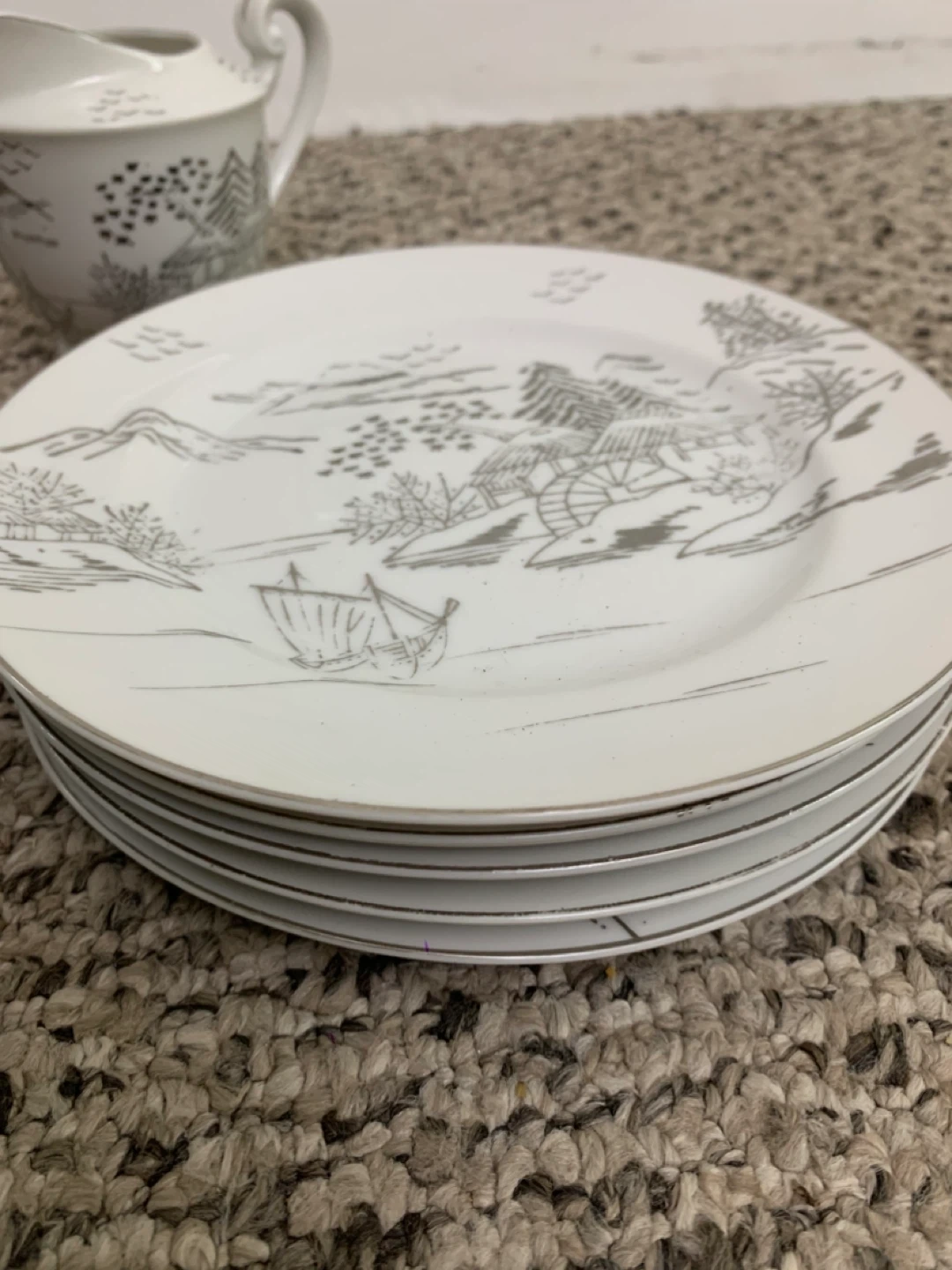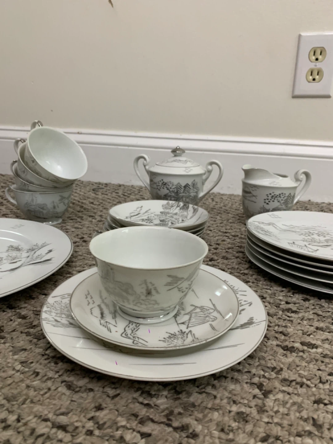 Selling a beautiful vintage white china tea set! It includes a teapot, creamer, sugar bowl, several cups and saucers, and plates. The set has a lovely, delicate design. Perfect for tea parties or adding a touch of elegance to your dining table