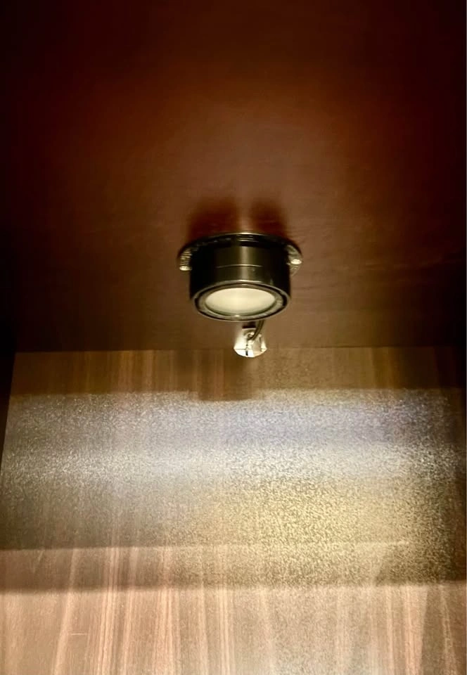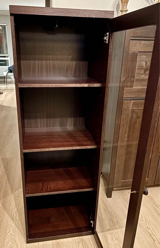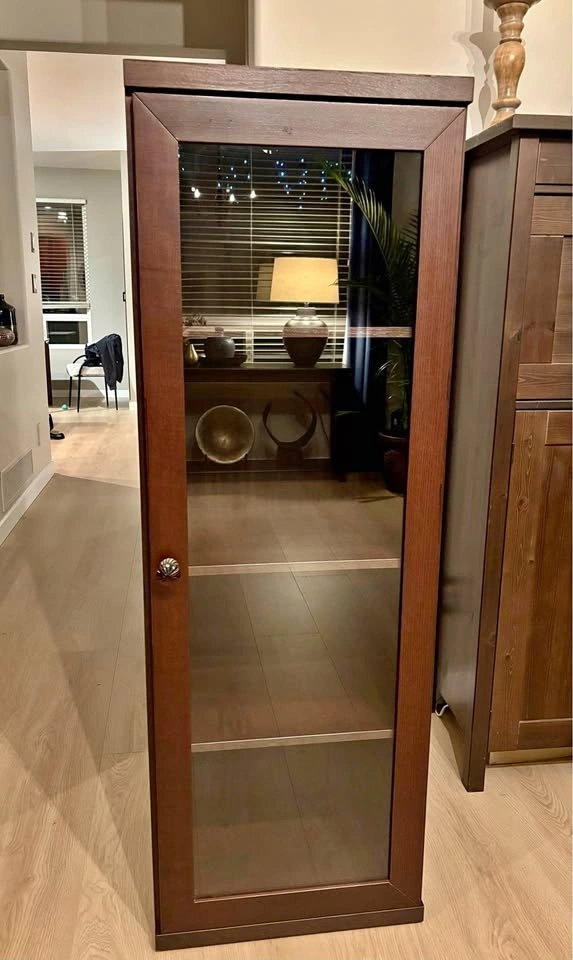IKEA curio cabinet with display shelves and a glass-front door. Very good condition, just a couple of scratches that aren’t very visible. There’s an “anti-topple” device attached at the back to screw into the wall, along with a light installed above the top shelf but it’s missing the adapter. A glass Anthropologie knob is added for extra charm! Dimensions are: 19.5”W x 16”D x 57.5”H.