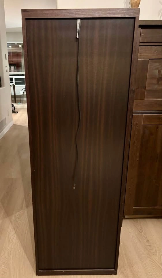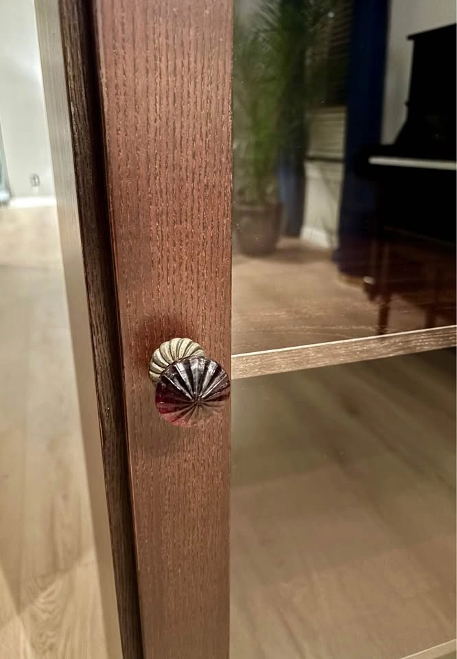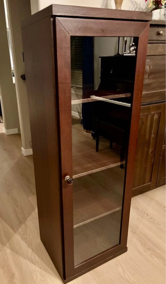 IKEA curio cabinet with display shelves and a glass-front door. Very good condition, just a couple of scratches that aren’t very visible. There’s an “anti-topple” device attached at the back to screw into the wall, along with a light installed above the top shelf but it’s missing the adapter. A glass Anthropologie knob is added for extra charm! Dimensions are: 19.5”W x 16”D x 57.5”H.