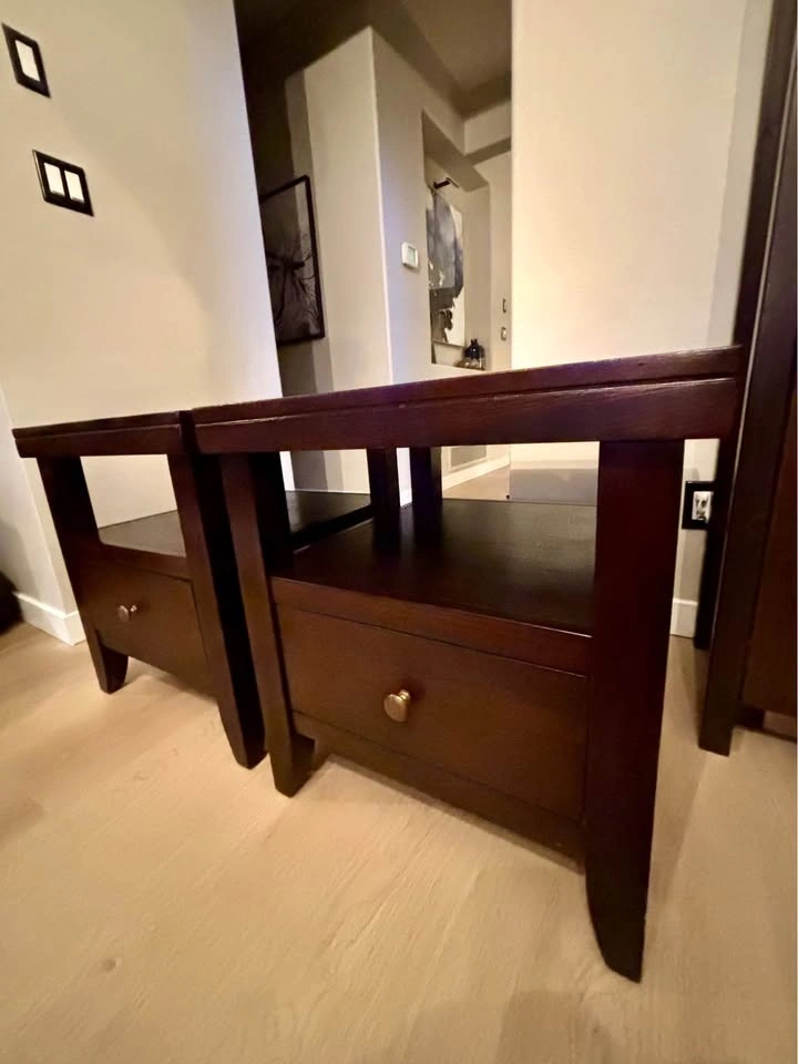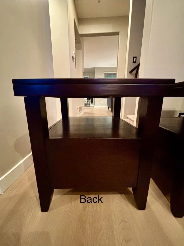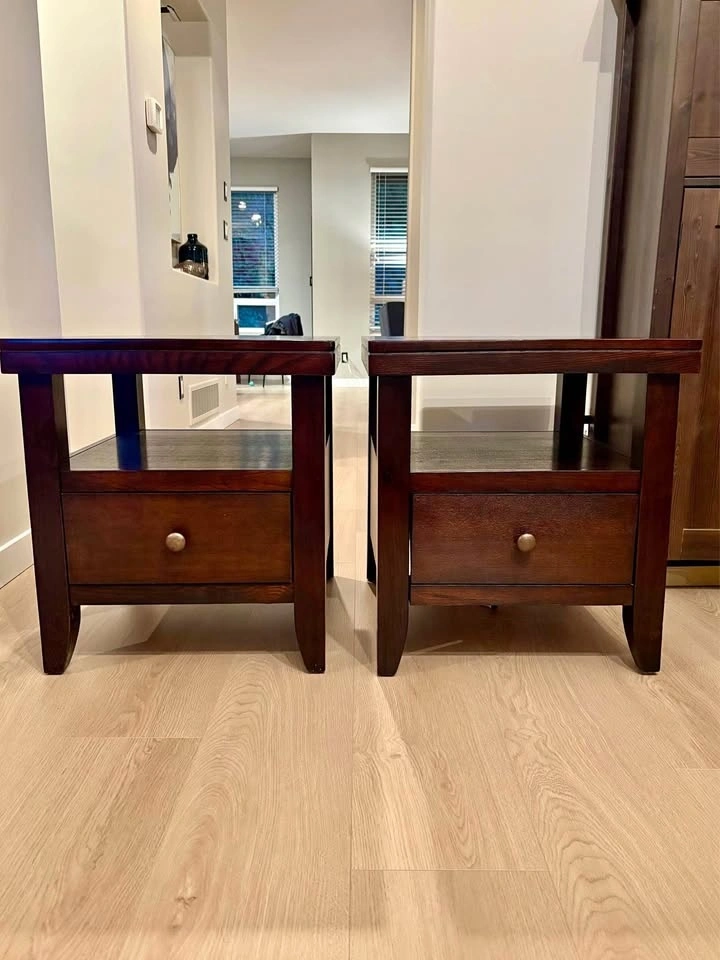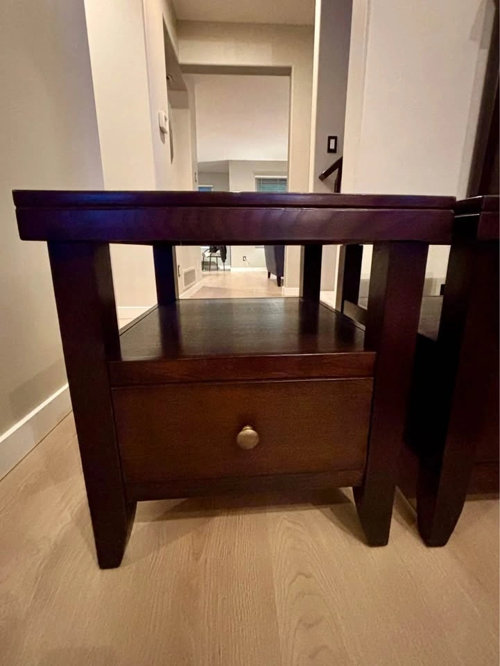 Two dark walnut end tables with a shelf and a drawer. Excellent condition with a couple of minor scratches. Can be sold separately or BOTH for $100! Dimensions are: 22”W x 24”D x 24”H.