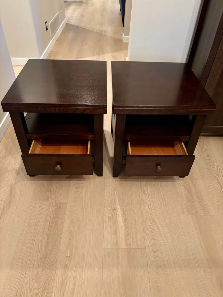 Two dark walnut end tables with a shelf and a drawer. Excellent condition with a couple of minor scratches. Can be sold separately or BOTH for $100! Dimensions are: 22”W x 24”D x 24”H.