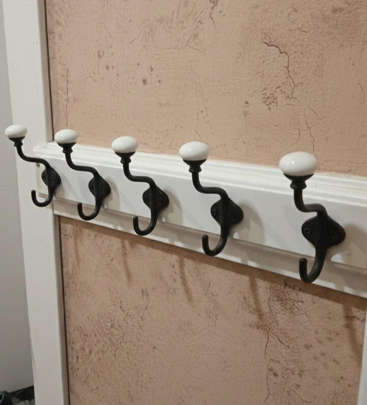 Here's a coat rack featuring five sturdy hooks, perfect for tidying up your entryway or closet. It's a classic design that will complement any decor!