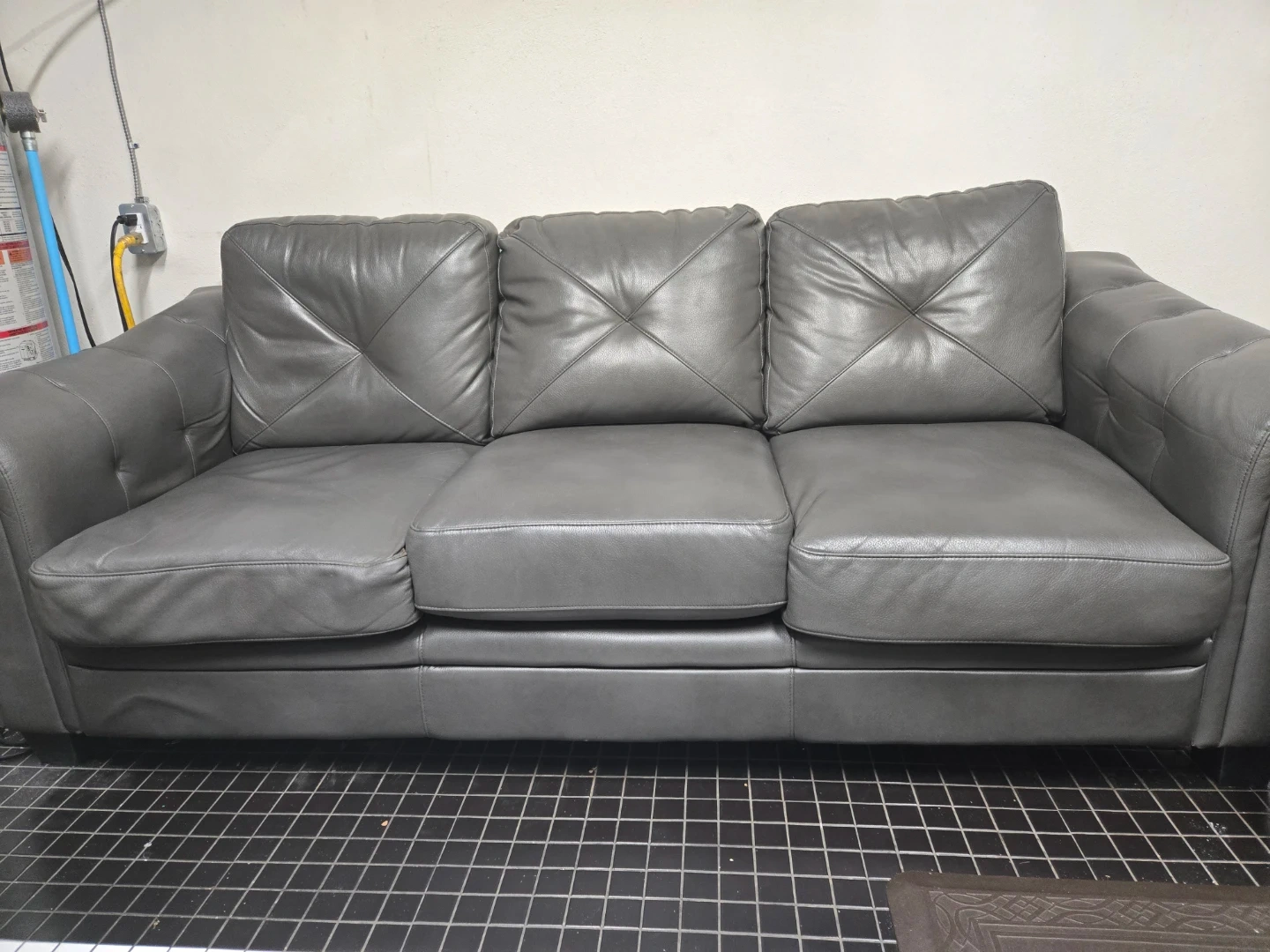 Selling a comfy grey synthetic leather sofa! It’s in good condition and would look great in any living room. The sofa features a classic design with cushioned seats and backrests, perfect for relaxing after a long day. The left side has been used the most, while the other sections are solid and in very good condition. It does have a small tear, but that’s all. If you’re interested, send me a message!
