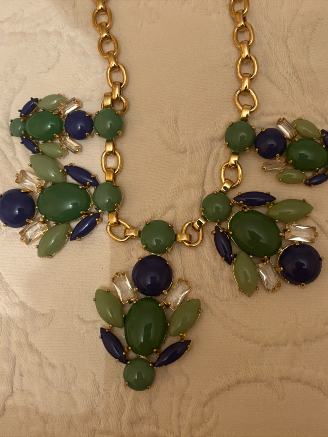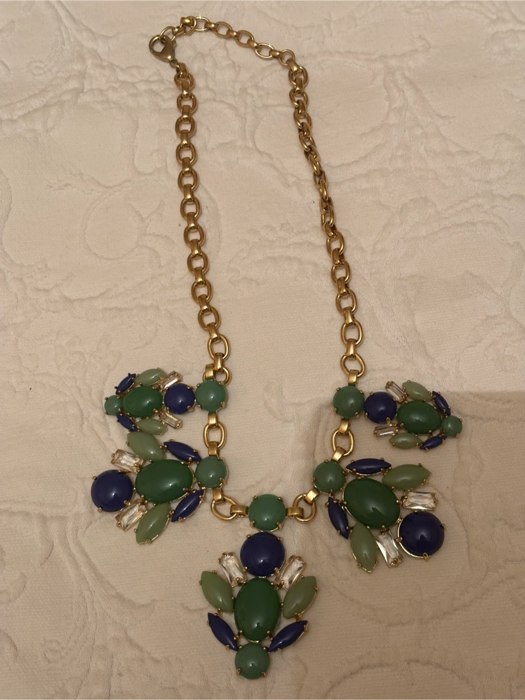 This is a J. Crew statement necklace with green and blue stones. It's perfect for adding a pop of colour to any outfit!