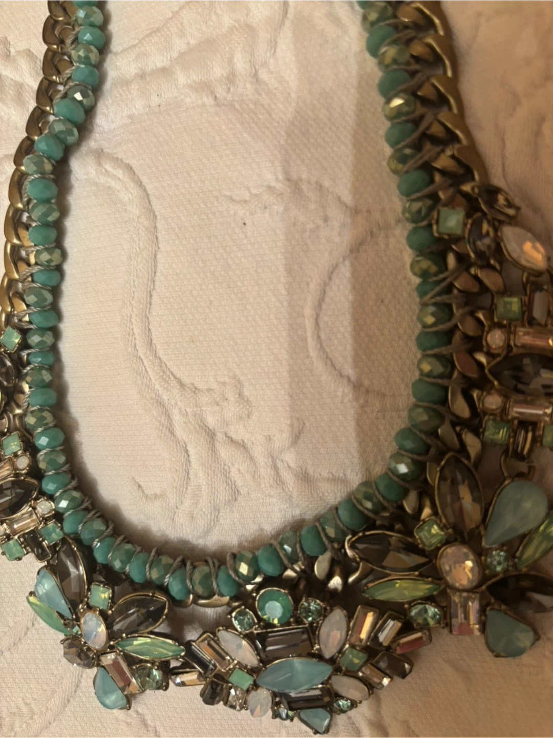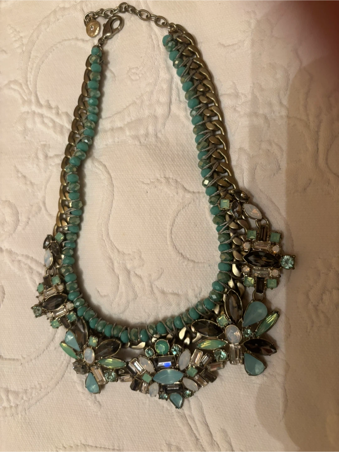 Beautiful statement necklace with turquoise beads and silver-tone chain detailing. It features a mix of stones and floral accents. Perfect for adding a pop of colour to any outfit!