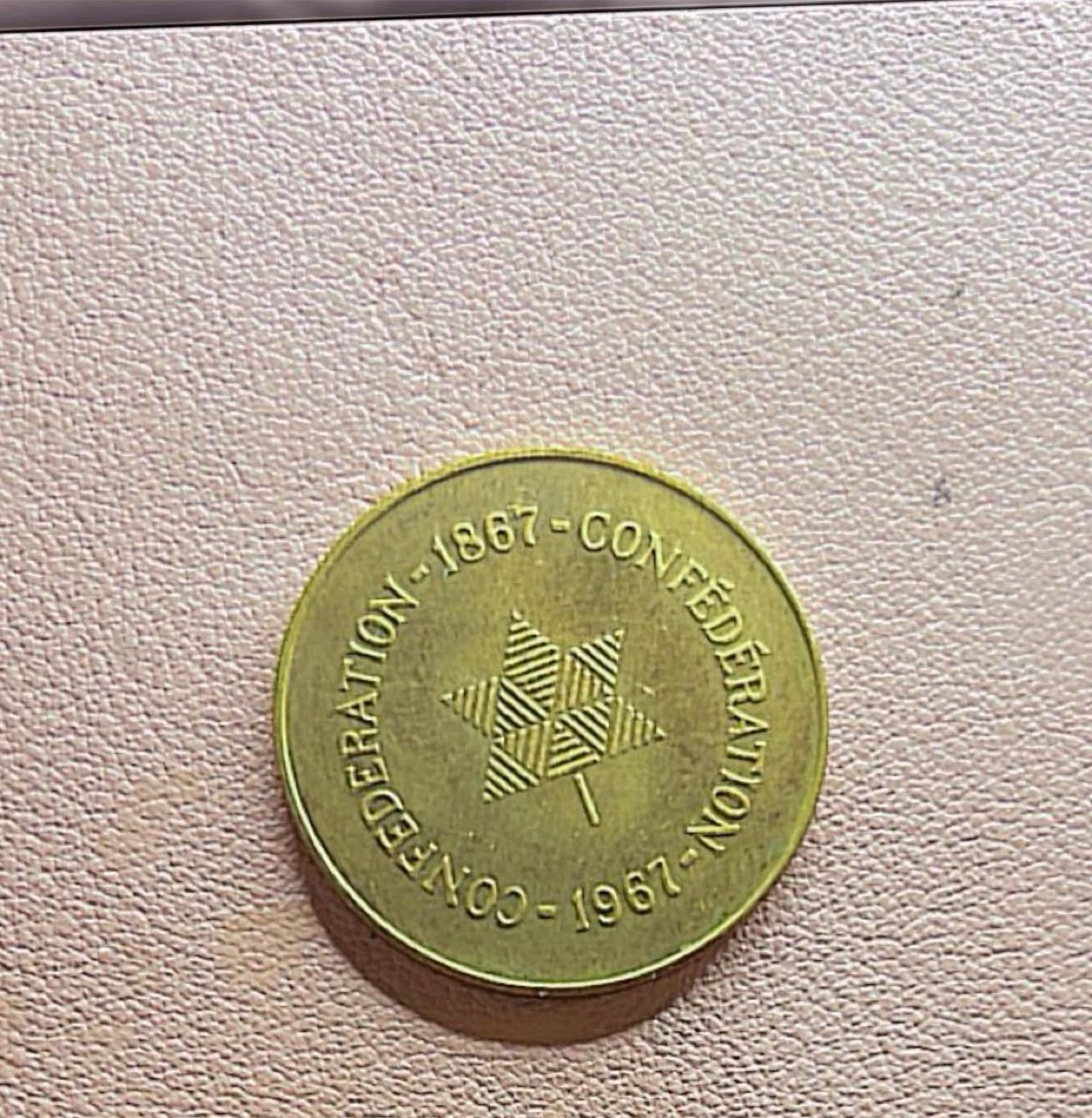 Selling a commemorative coin from Canada's Confederation in 1867-1967. It features a maple leaf design and the Canadian coat of arms. A great piece of Canadian history!
