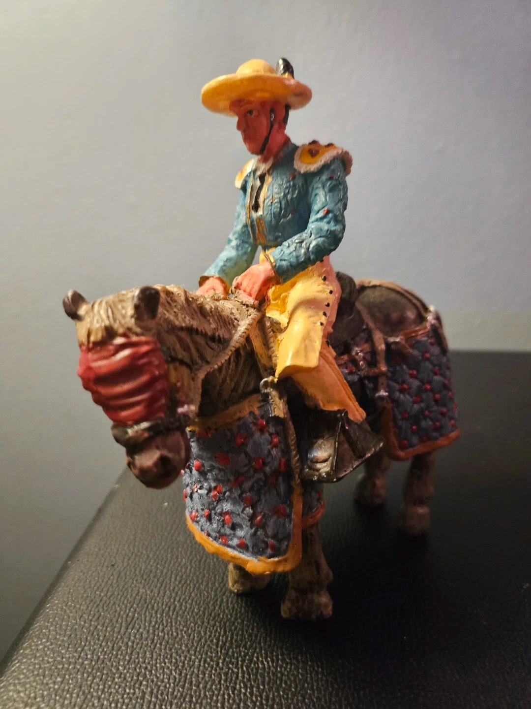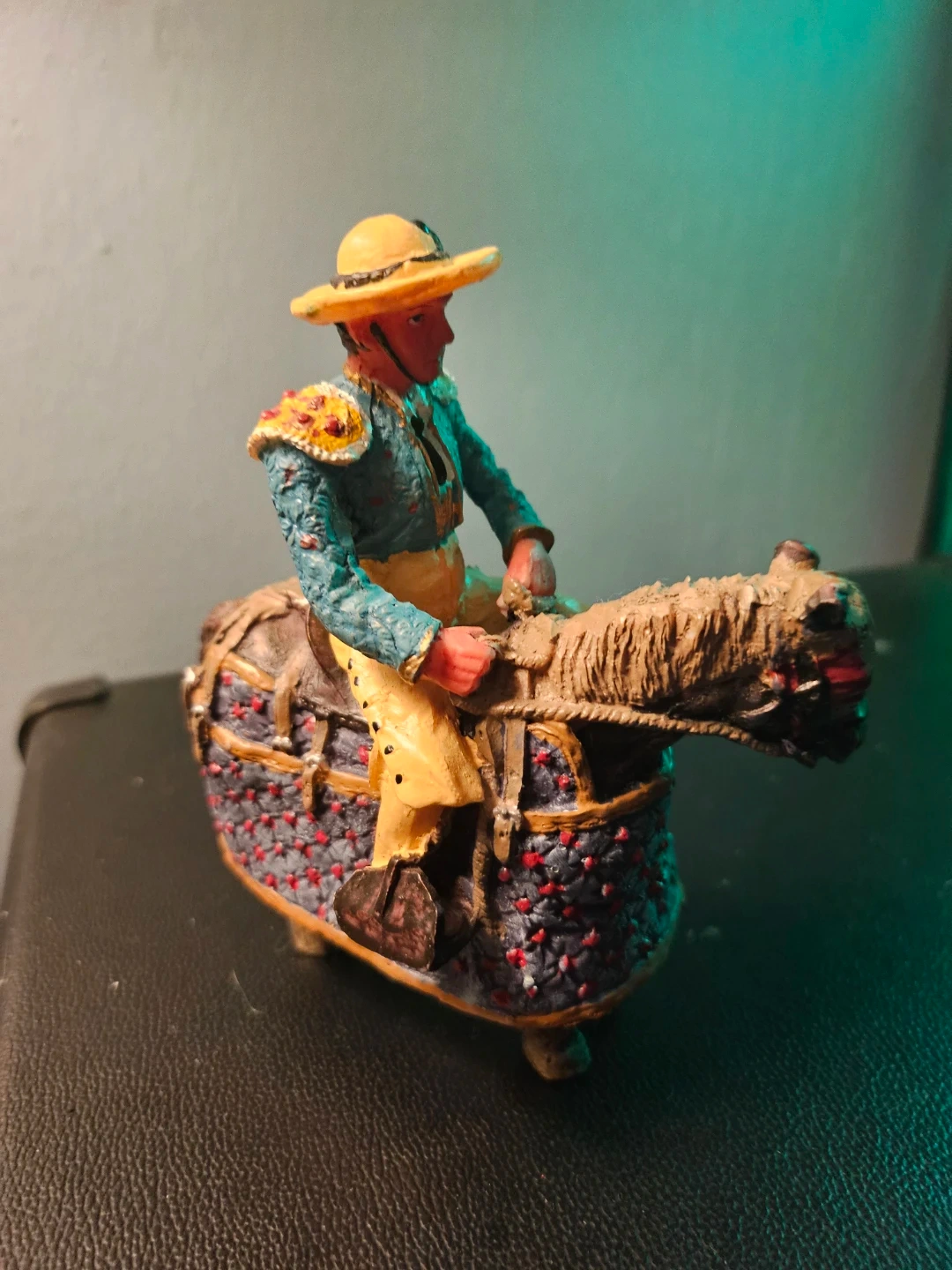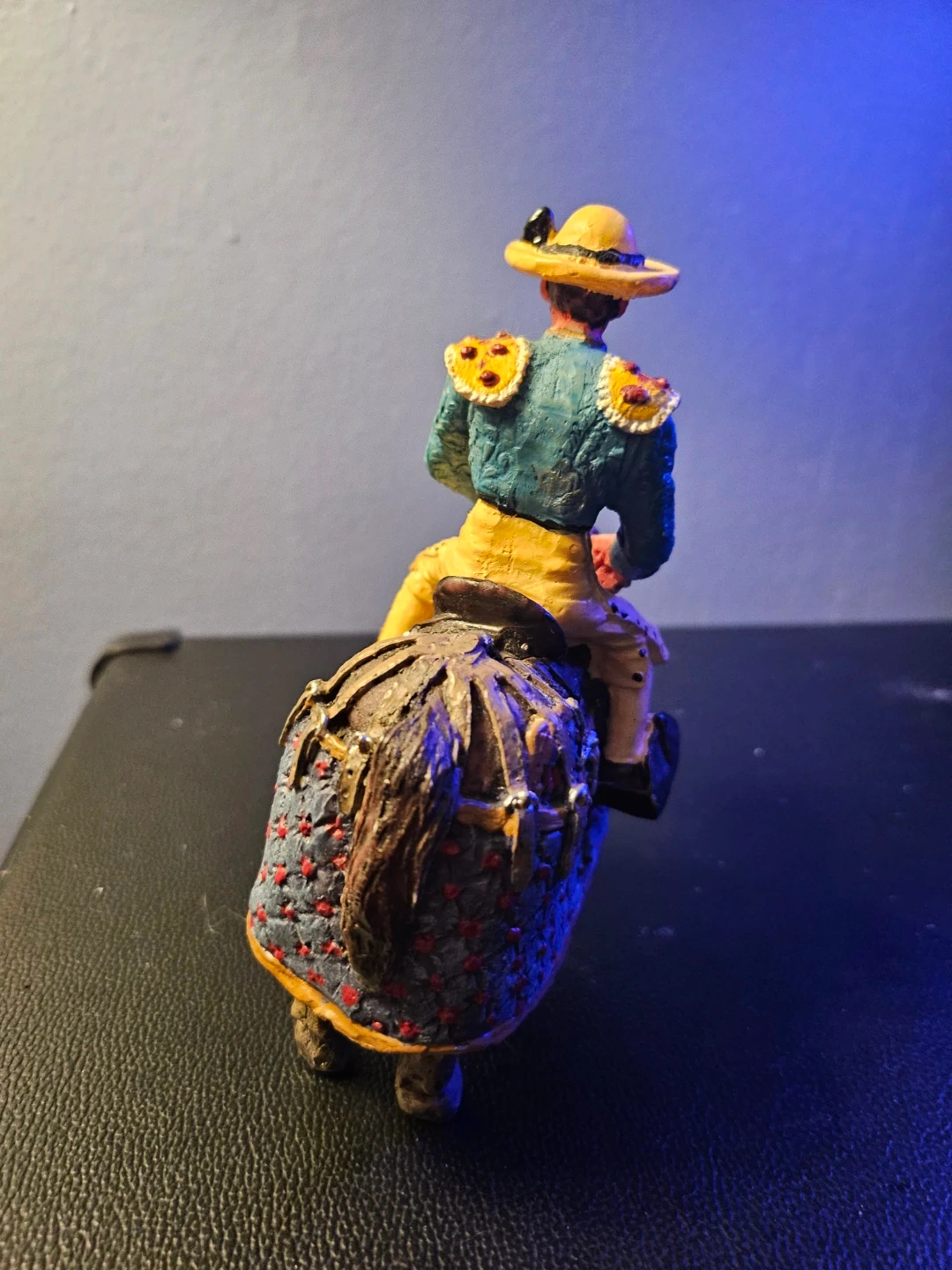 Here's a unique figurine of a matador riding a horse. It's a colourful piece with intricate details. Would look great as a decorative item!