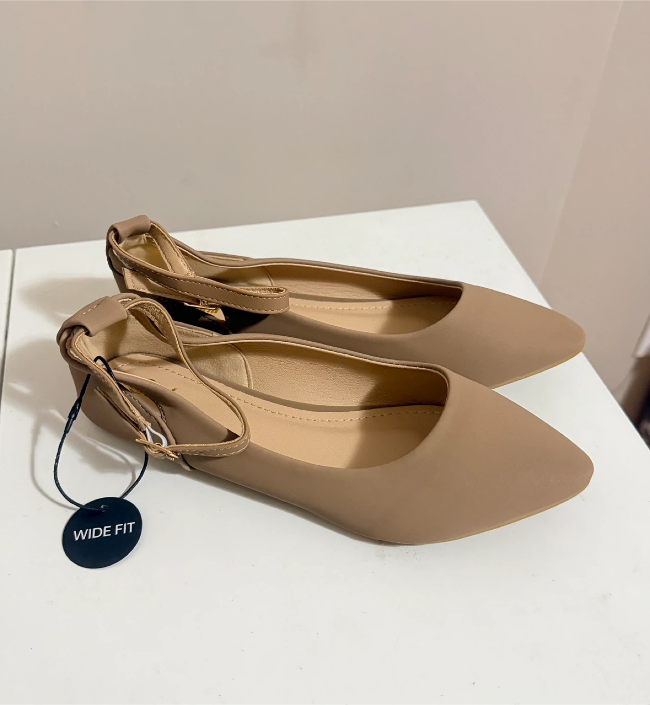Stylish beige pointed-toe flat shoes with an elegant ankle strap.