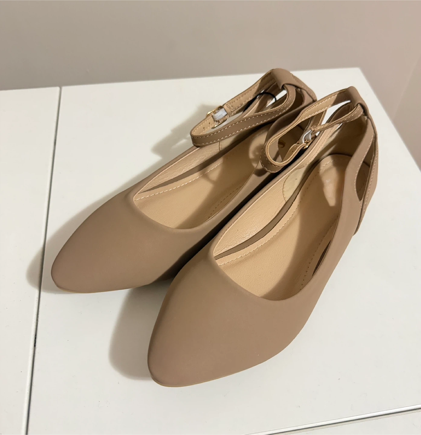Stylish beige pointed-toe flat shoes with an elegant ankle strap.