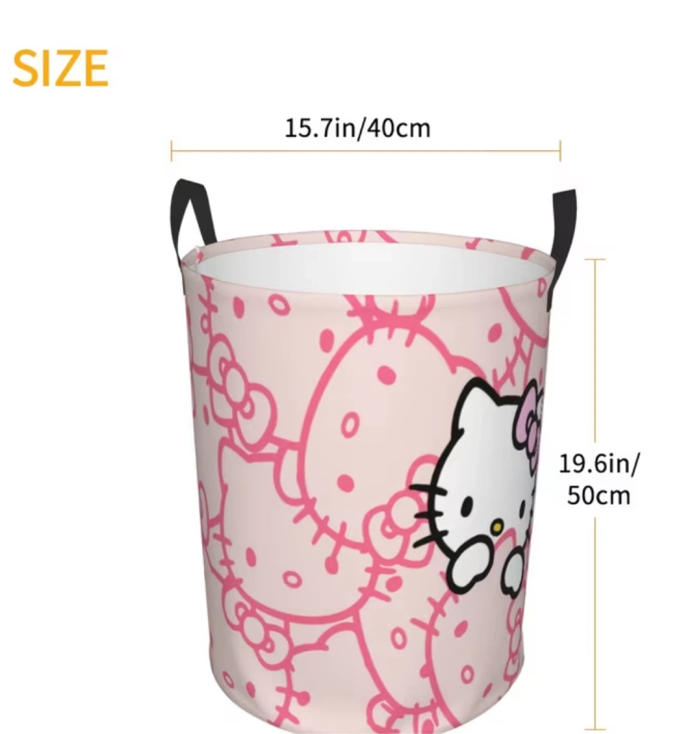 Here's a cute Hello Kitty laundry hamper! Portable storage hamper with sturdy handle, easy storage and collapsible design, suitable for organizing housework in any room. It measures approximately 15.7 inches in diameter and 19.6 inches in height.