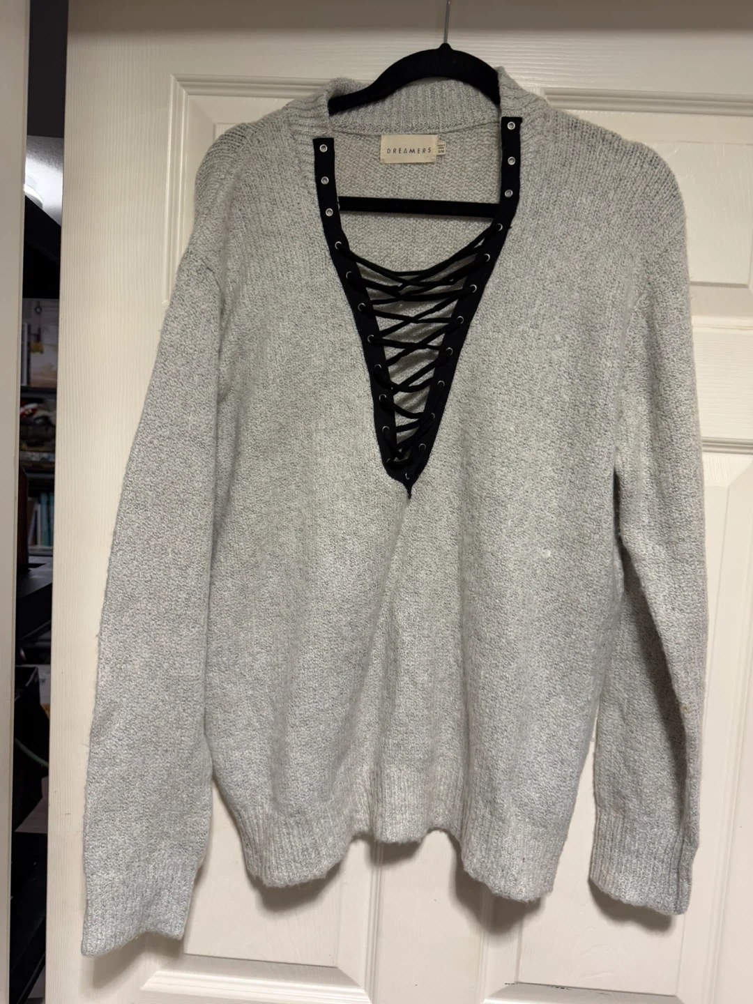 Buy & SellDreamers Grey Lace-Up Sweater - Size S/MDreamers Grey Lace-Up Sweater - Size S/M$10Selling a cute grey sweater from Dreamers! It has a unique lace-up detail at the front. Size is S/M.BrandDreamersWHERE TO MEETCheck LocationView MapSELLERverifiedJMTynehead952 reviews0 chats·0 favorites·1 viewsSEND CHAT TO SELLERHi JM! I’m interested in your listing.Hi JM! I’m interested in your listing.Get the Karrot app to chatSign In to chat