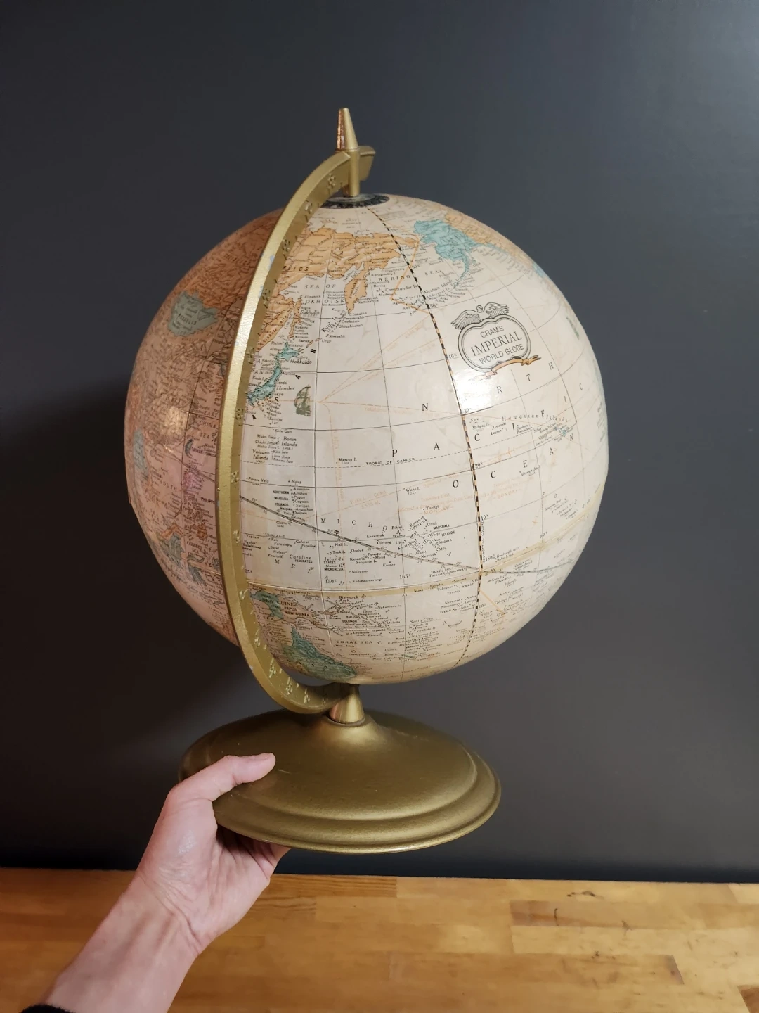 Vintage world globe by George F. Cram Co. It's a beautiful piece with a classic design. The globe features detailed cartography and a time dial at the north pole. It would make a great addition to any home or office!