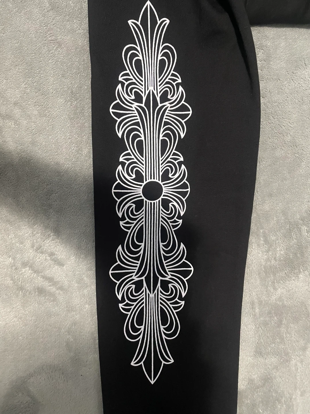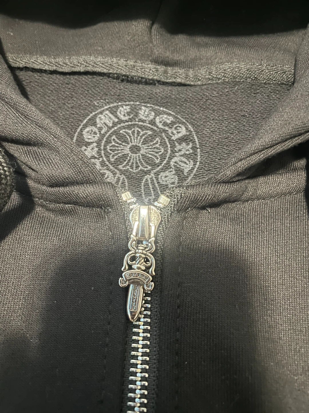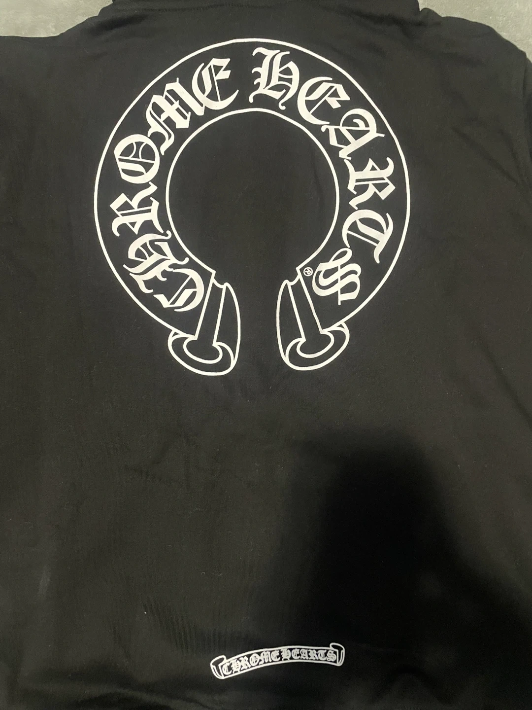 Selling a Chrome Hearts hoodie in black, size medium. It features the classic Chrome Hearts horseshoe logo on the back and cross designs down the sleeves. The zipper pull also has the Chrome Hearts dagger design.