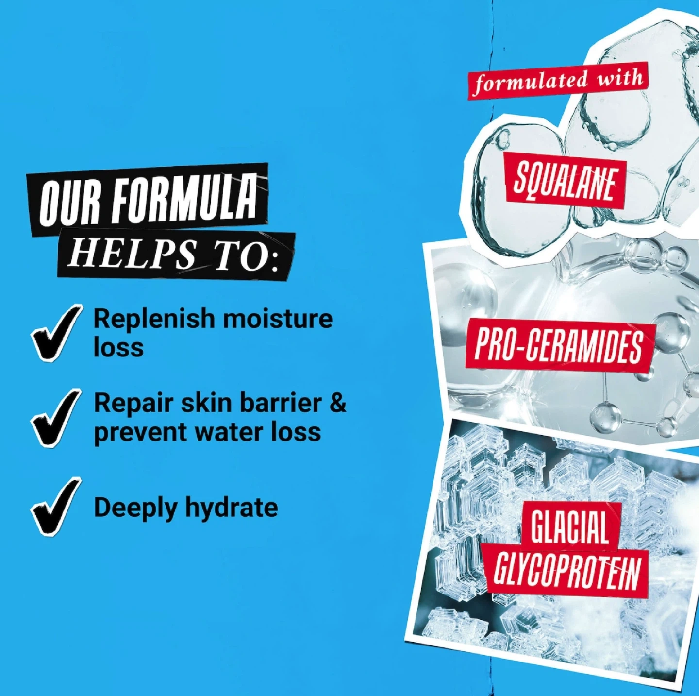 It contains squalane, pro-ceramides, and glacial glycoprotein. This cream helps to replenish moisture, repair skin barrier, prevent water loss, and deeply hydrate