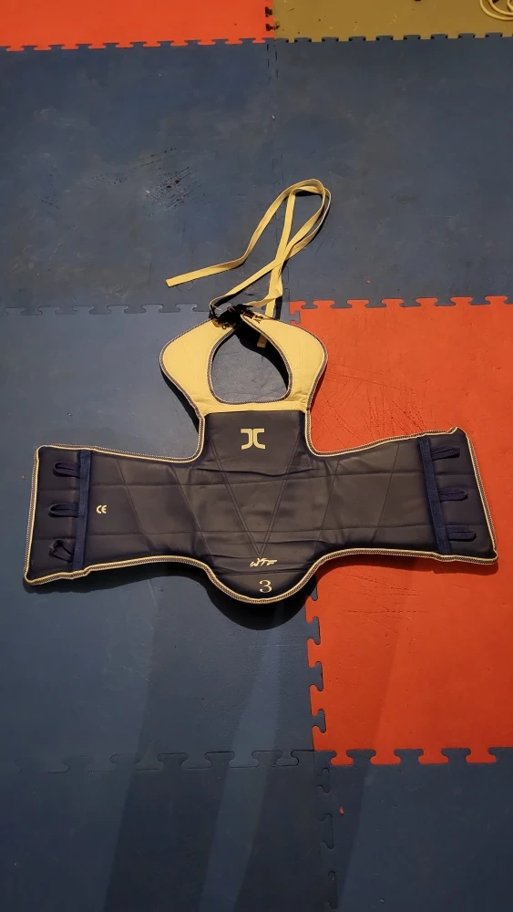 Selling a taekwondo chest protector in great condition! It's a size 3 and perfect for sparring or training. The chest protector features a navy blue and white design with the WTF logo.