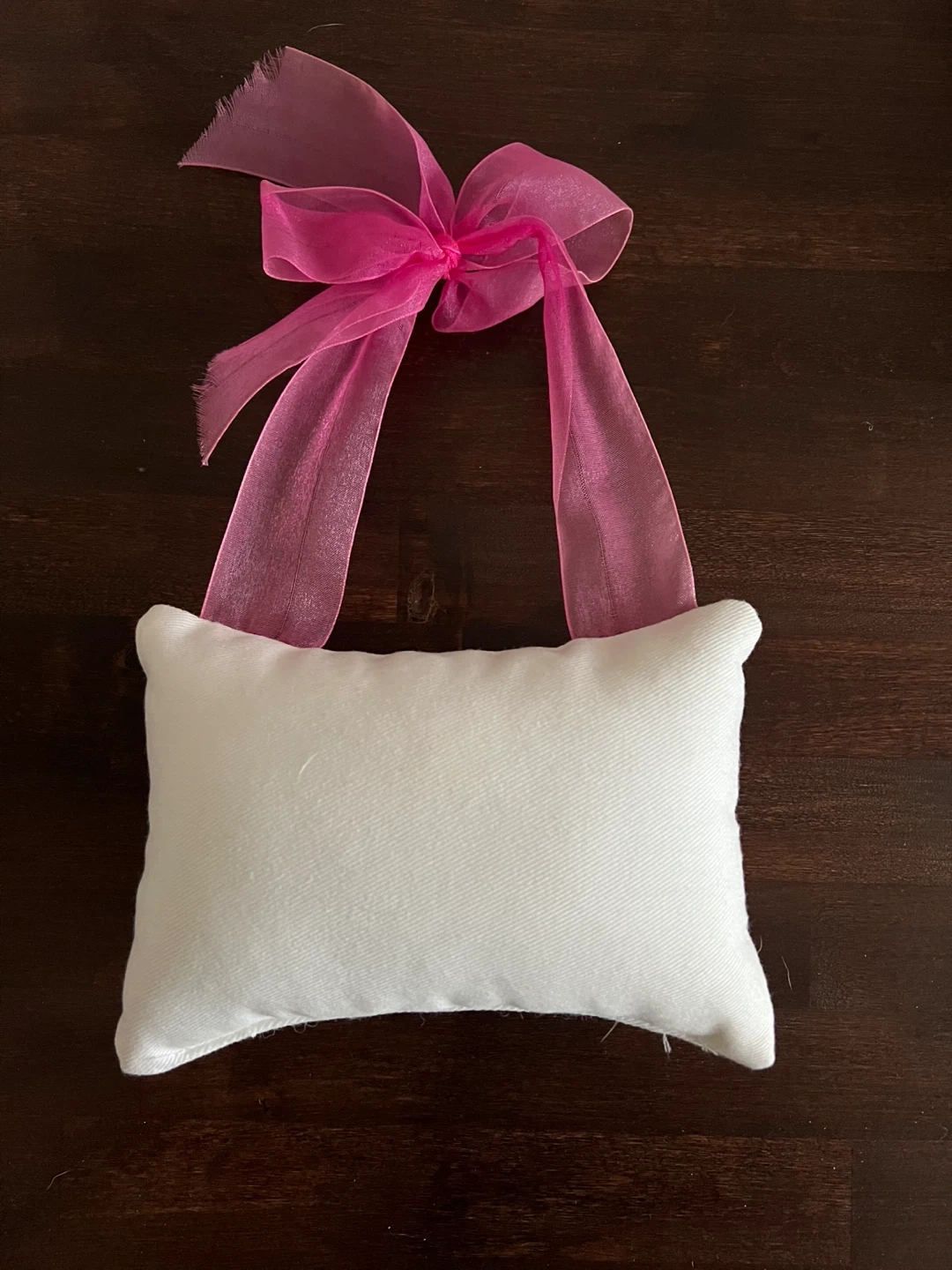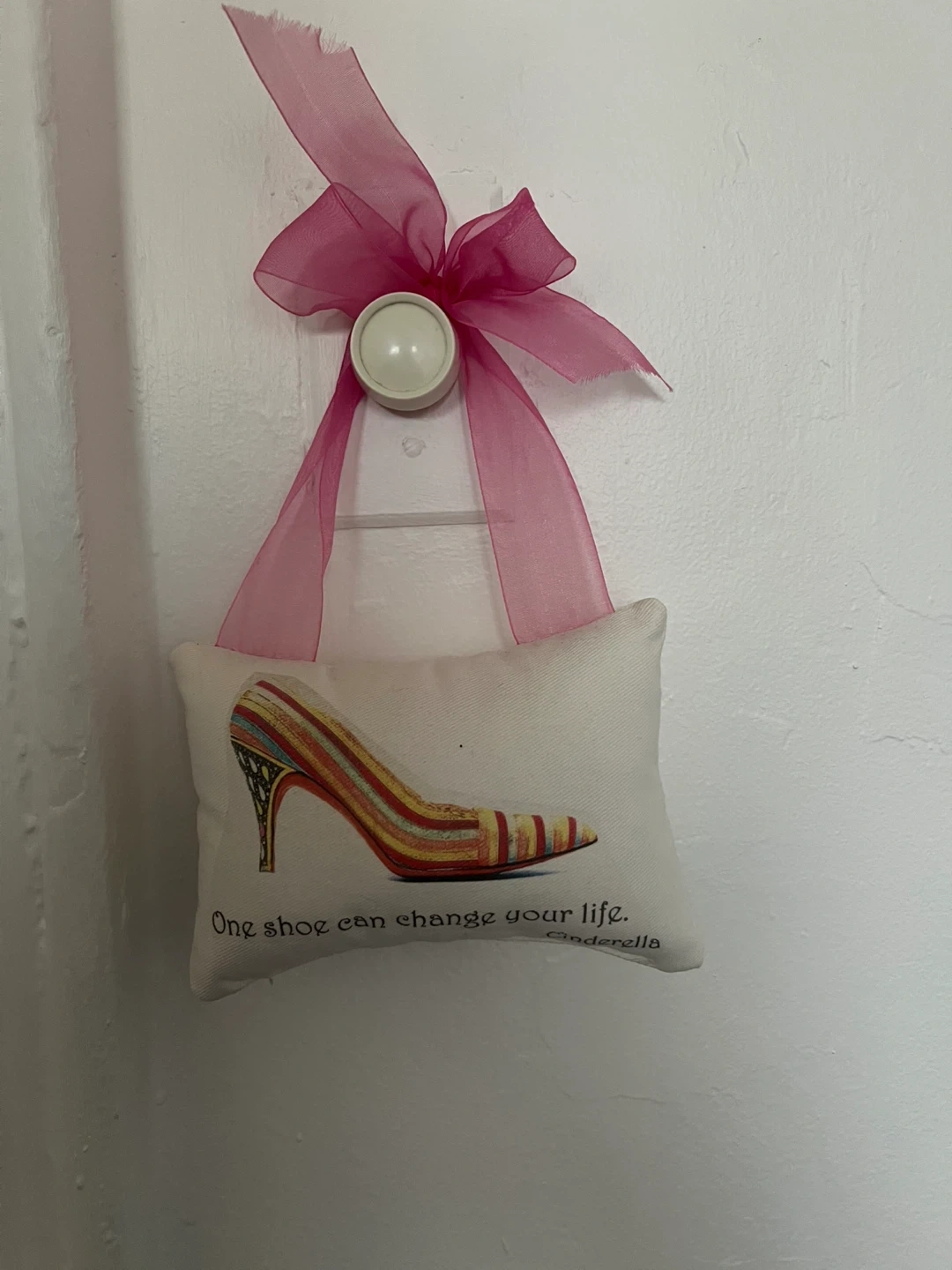This is a cute Cinderella shoe pillow ornament. It has a pink bow on the top. The pillow has the quote 'One shoe can change your life’.