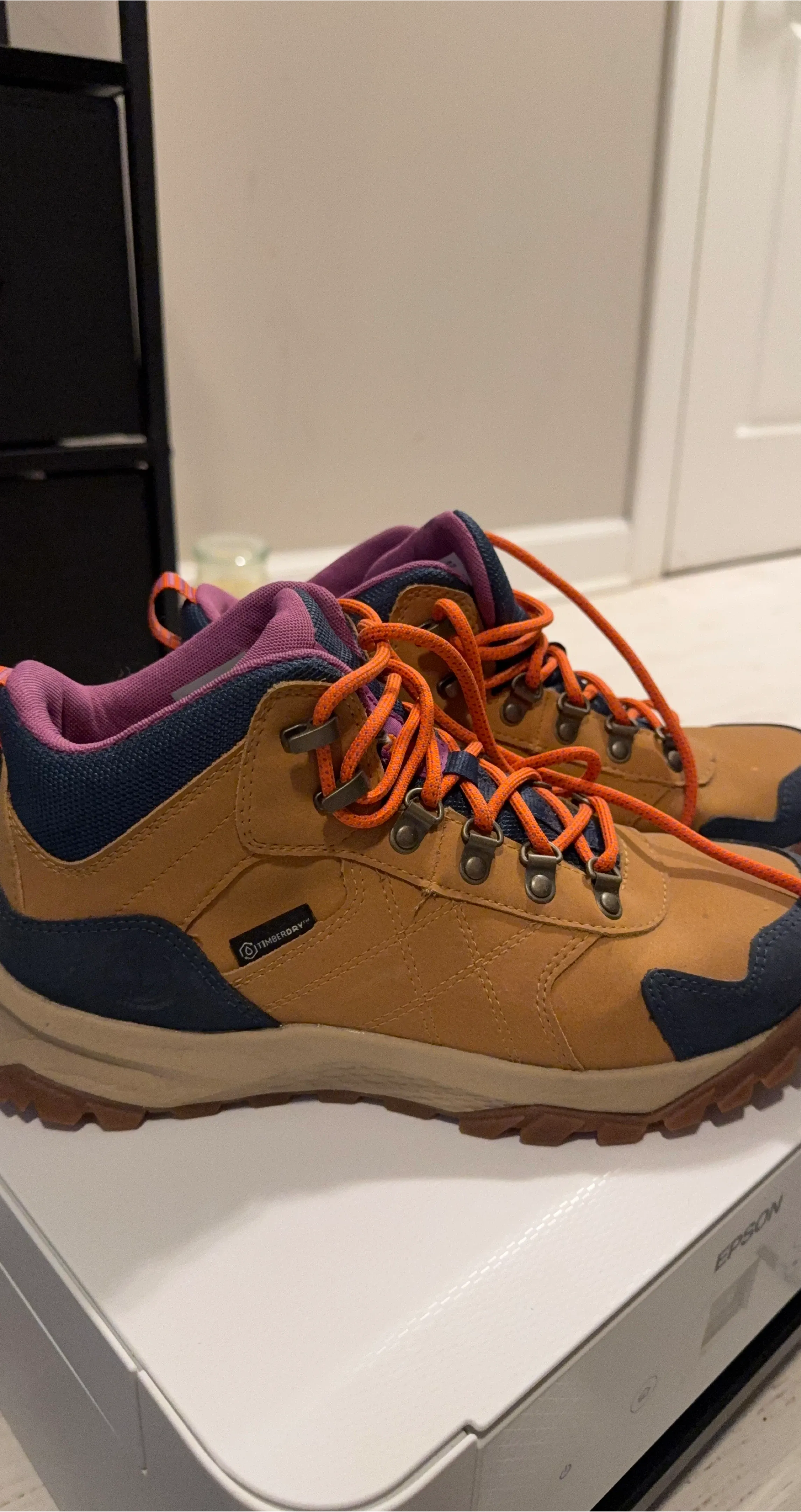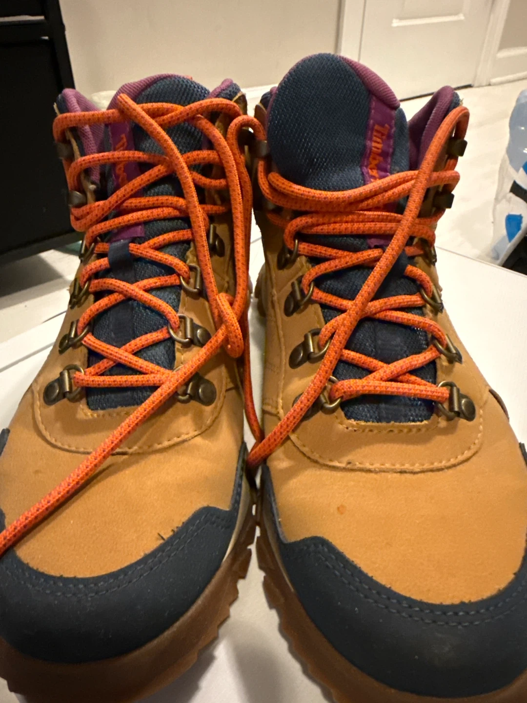 These Timberland hiking boots are ready for your next adventure! They feature a stylish design with orange laces and a durable build. Perfect for hitting the trails or just adding a rugged touch to your everyday look