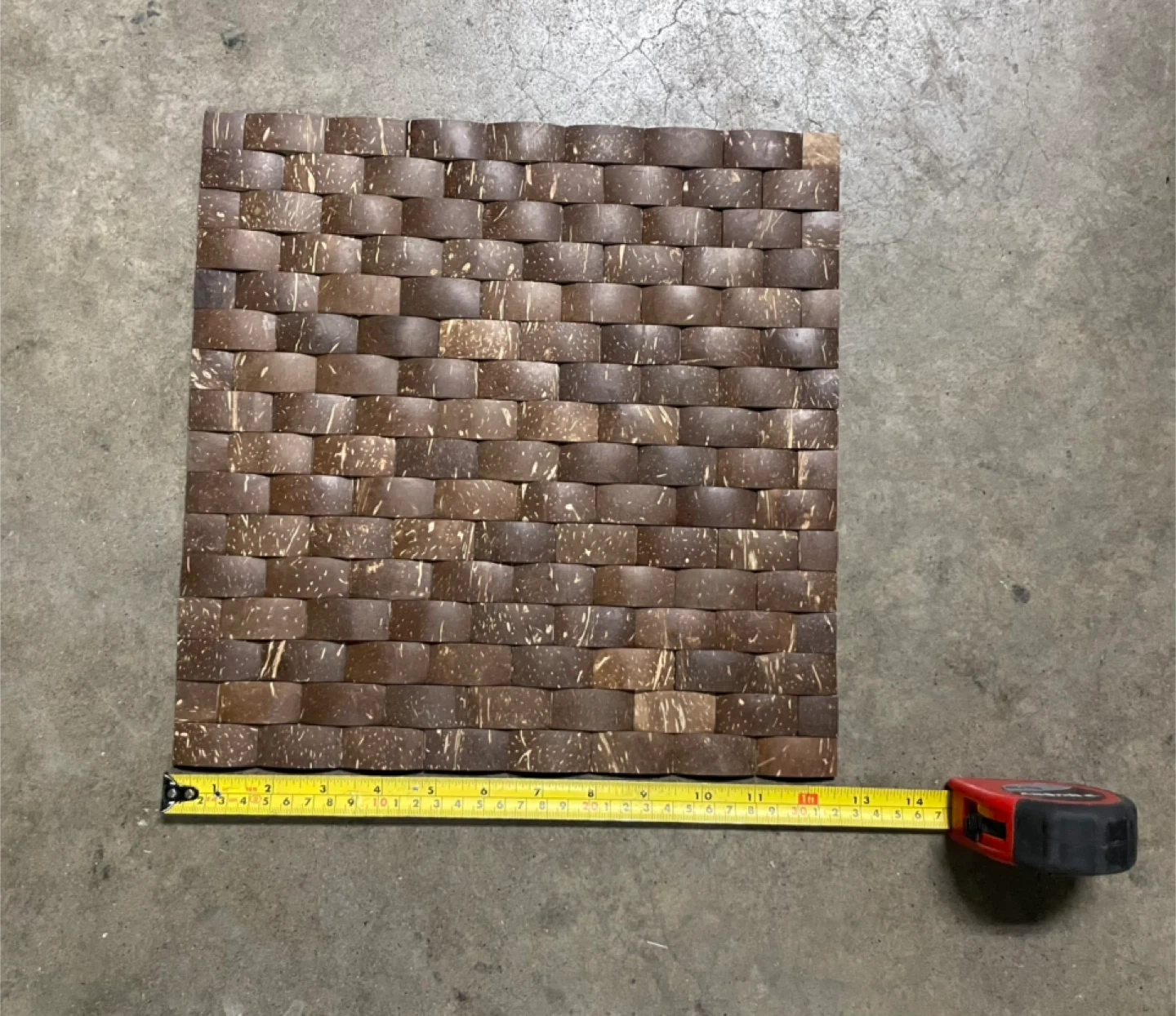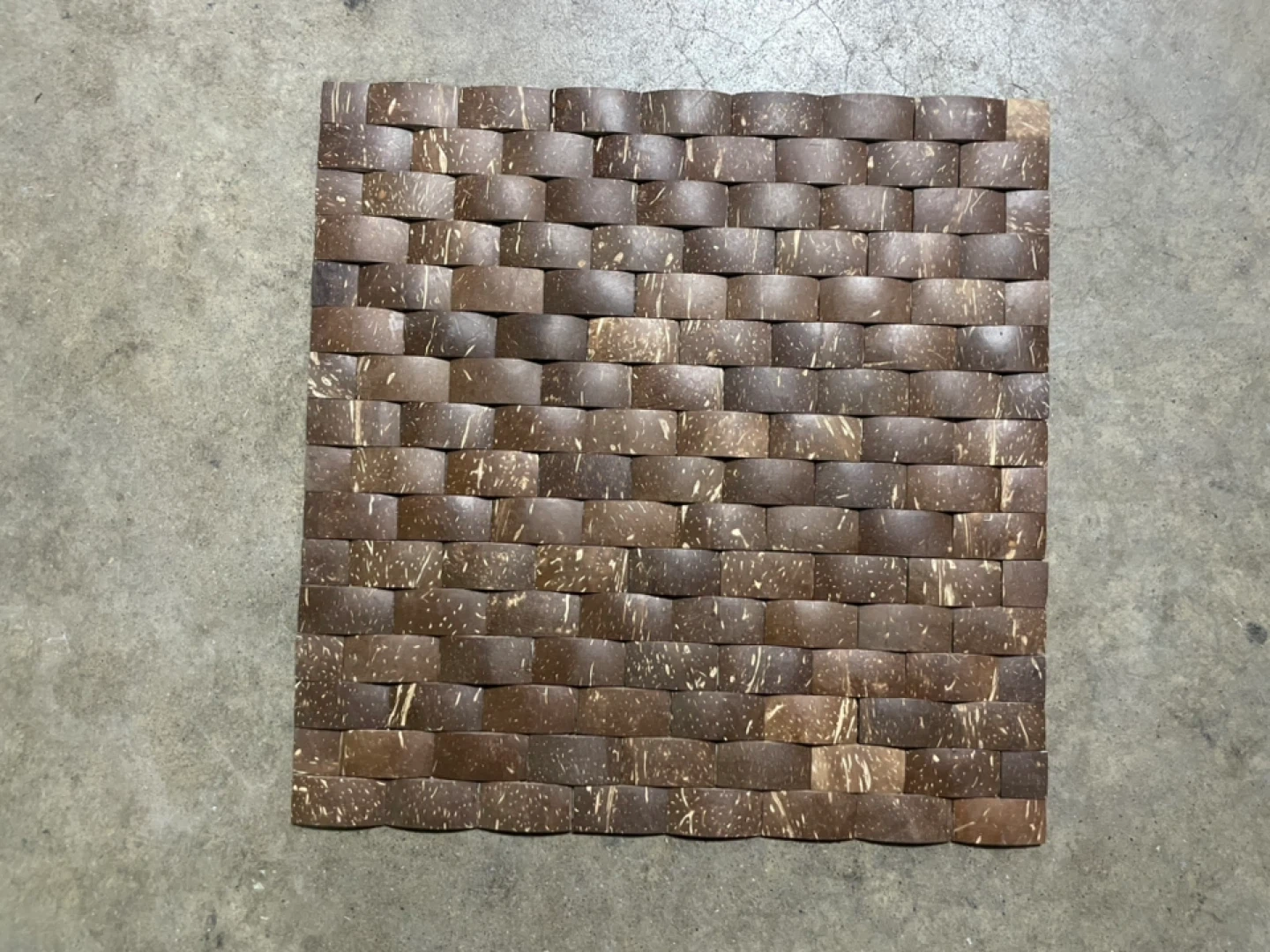 Selling a unique coconut shell mosaic tile! This tile is perfect for adding a natural, textured look to your space. It's made from real coconut shells and has a beautiful brown colour. It measures approximately 12 inches by 12 inches.