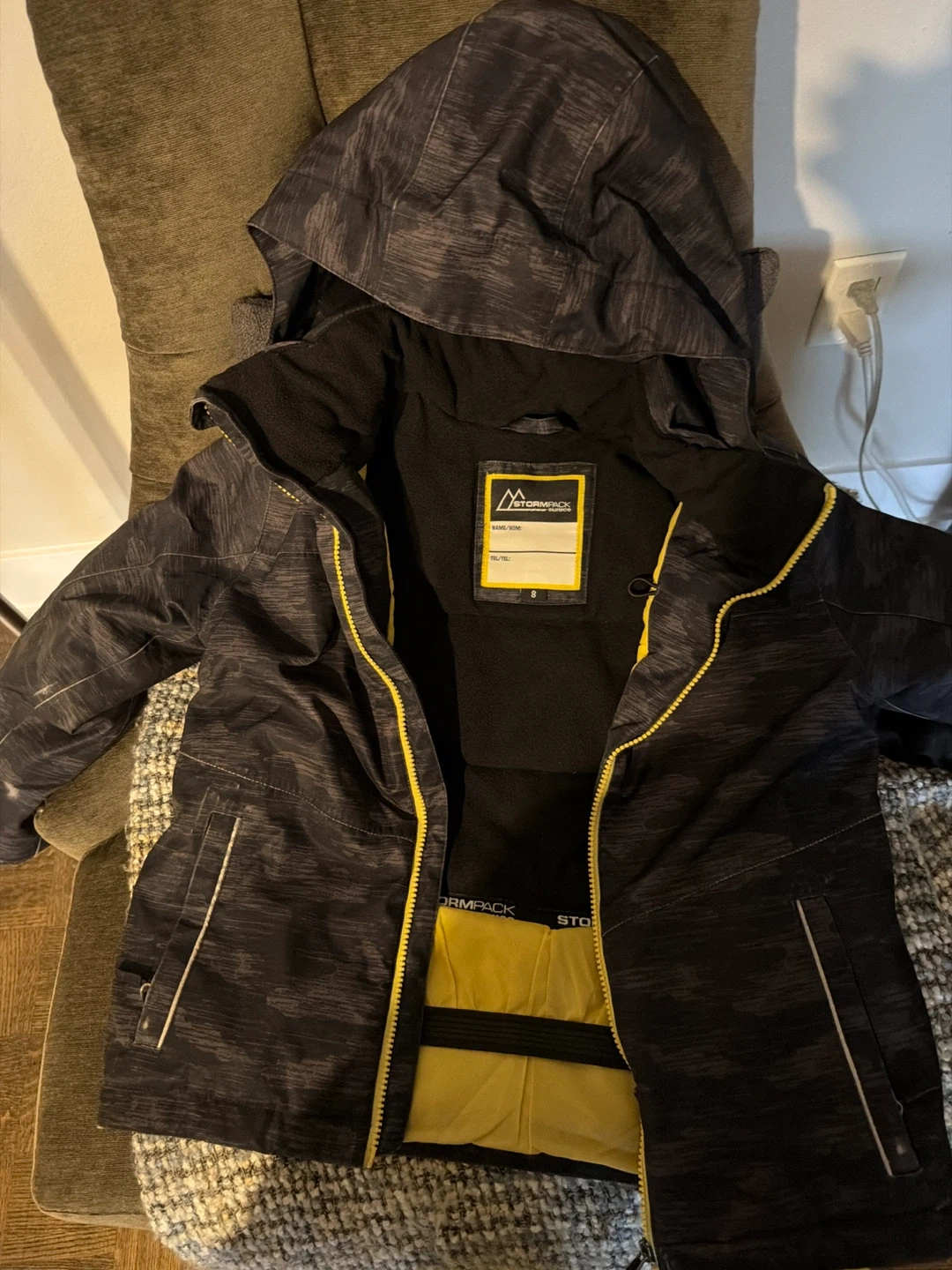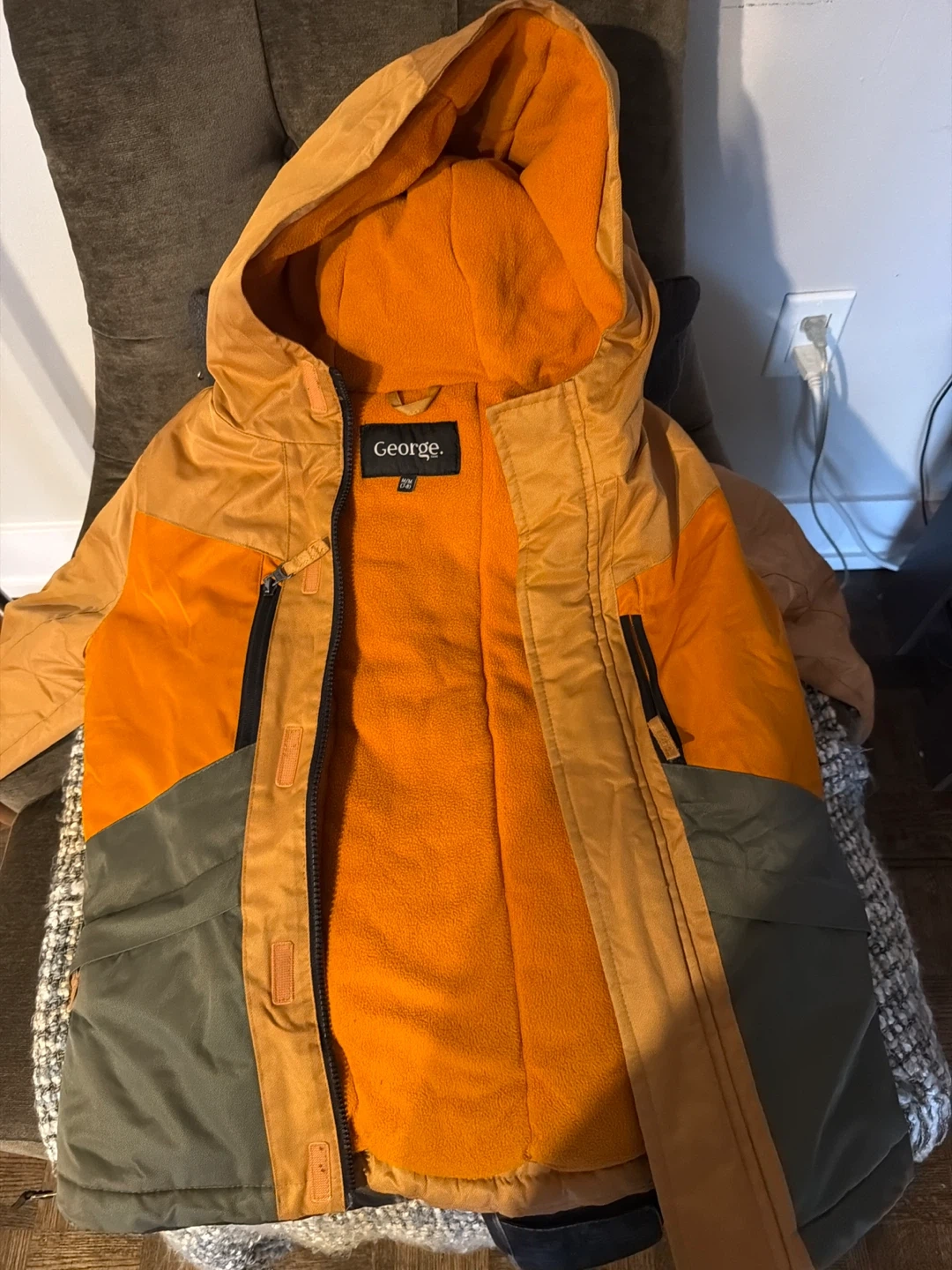 Selling two winter jackets for kids. One is a George brand jacket, size 12, with a colour block design in orange, tan, and grey. The other is a Stormpack jacket, also size 12, in black with yellow accents. Both are in great condition and ready for winter!