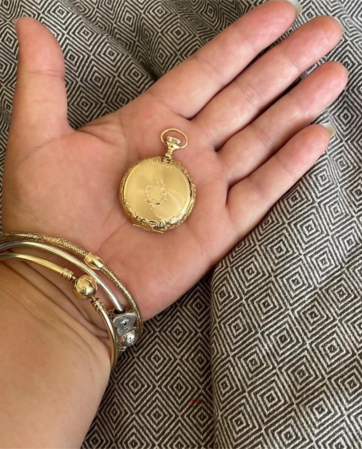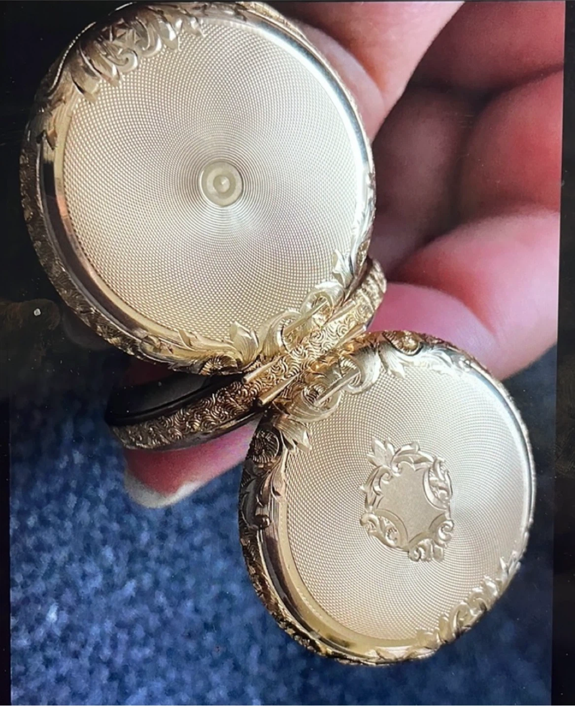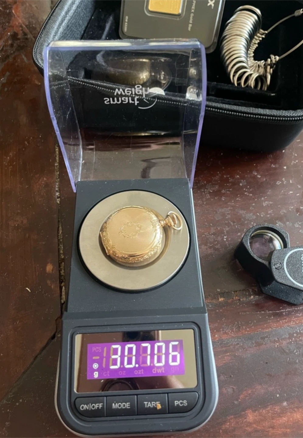 Selling an Elgin 14k gold pocket watch. It's a beautiful antique piece with intricate detailing and a classic design. The watch appears to be in good condition for its age, with a white face and Roman numeral markers. Perfect for collectors or anyone who appreciates antique timepieces.
