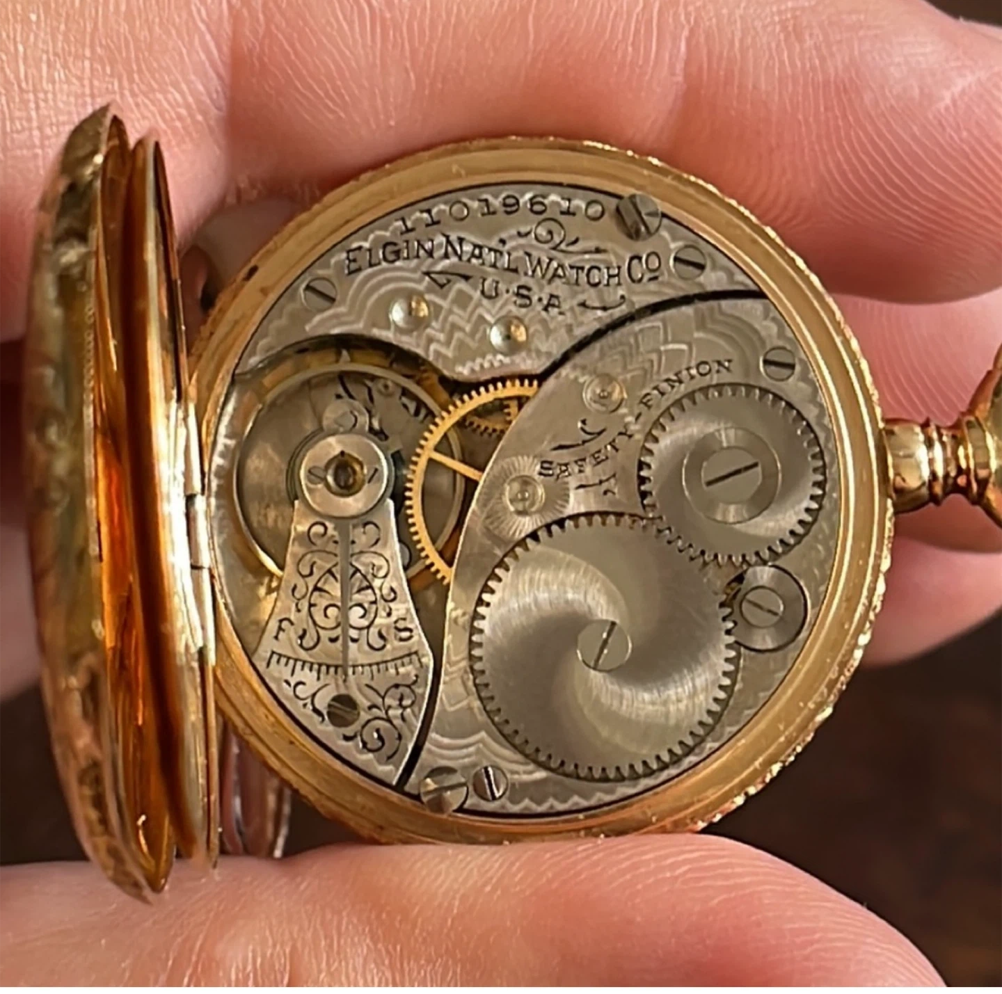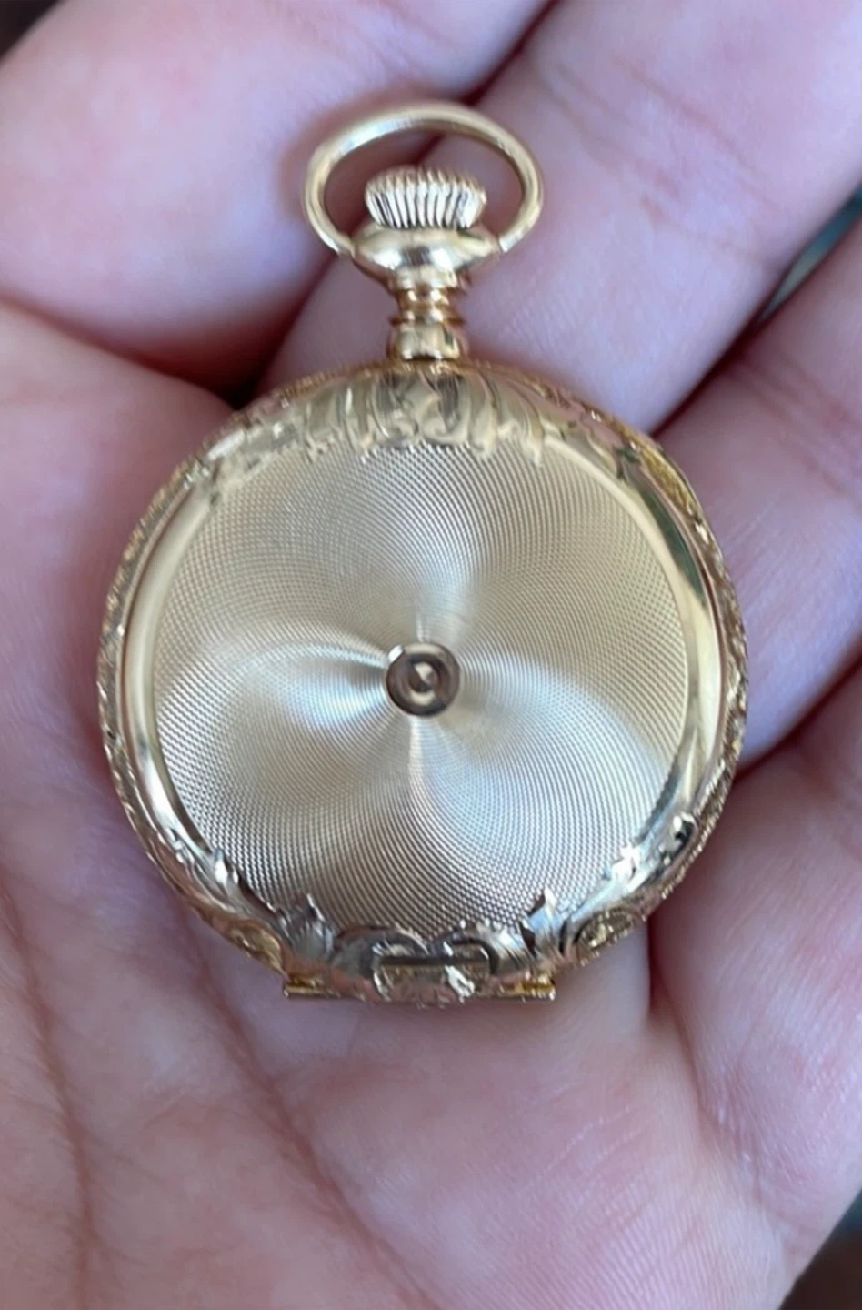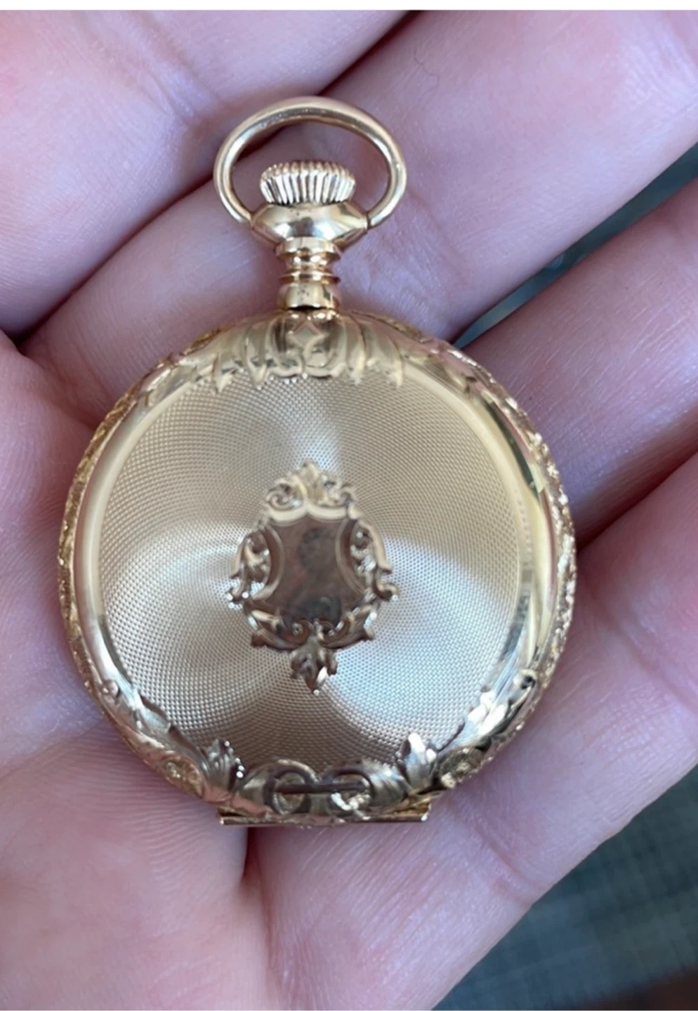 Selling an Elgin 14k gold pocket watch. It's a beautiful antique piece with intricate detailing and a classic design. The watch appears to be in good condition for its age, with a white face and Roman numeral markers. Perfect for collectors or anyone who appreciates antique timepieces.