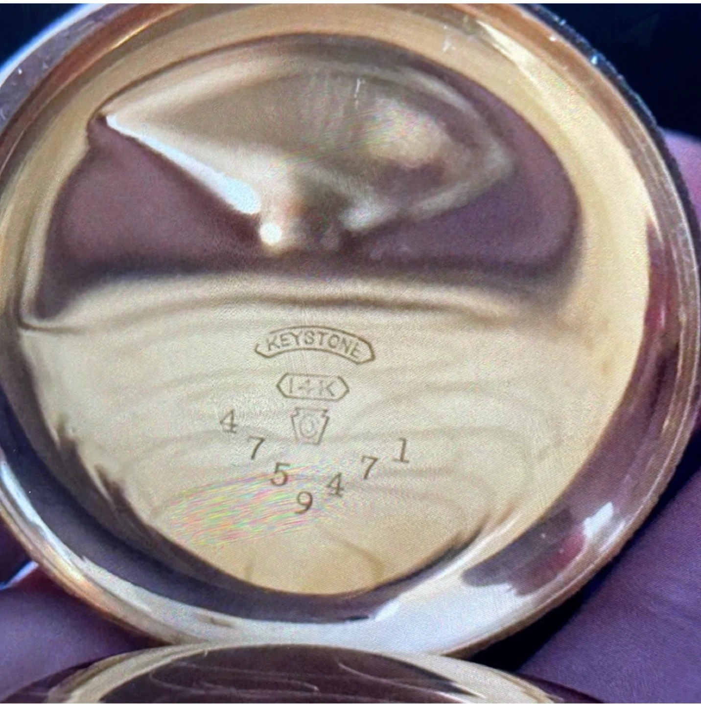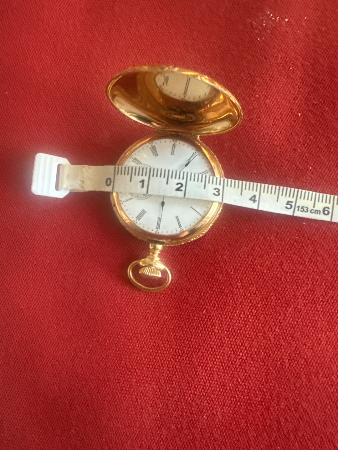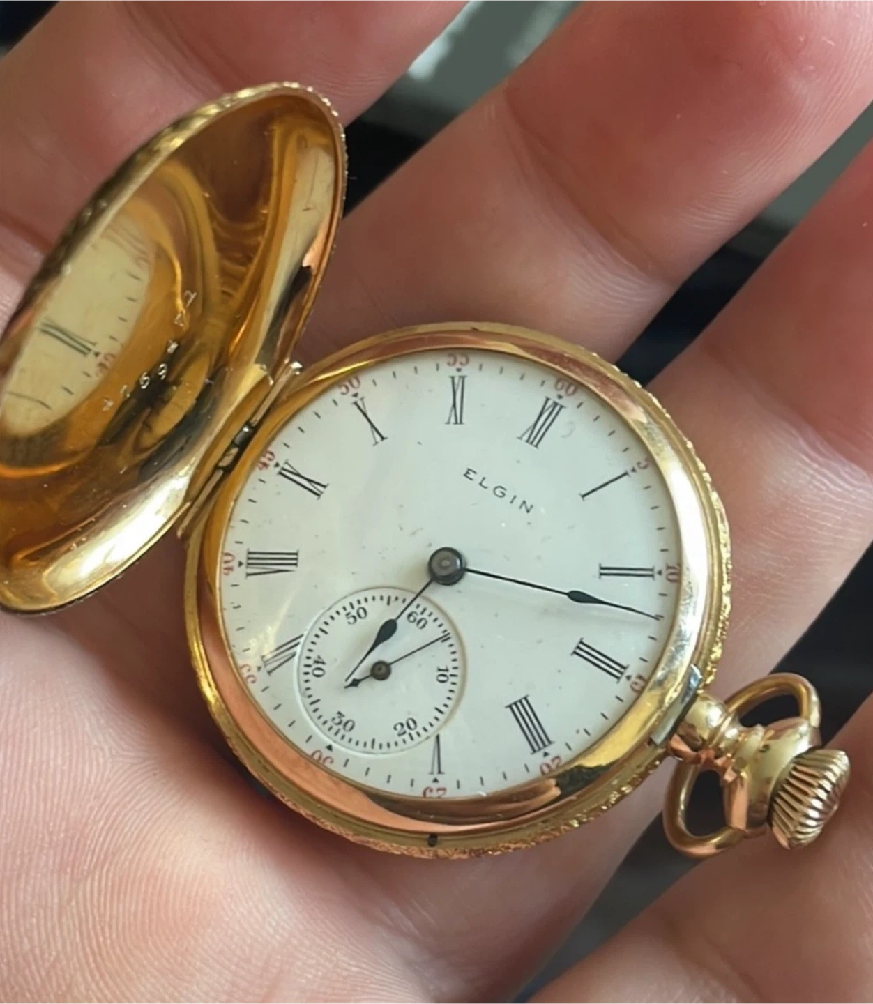Selling an Elgin 14k gold pocket watch. It's a beautiful antique piece with intricate detailing and a classic design. The watch appears to be in good condition for its age, with a white face and Roman numeral markers. Perfect for collectors or anyone who appreciates antique timepieces.