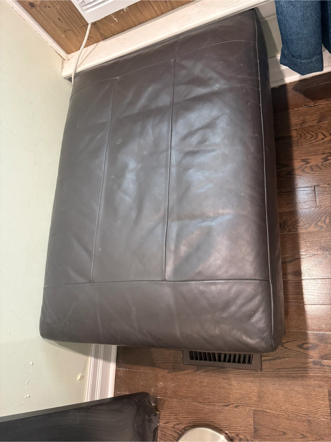 Can be used as extra seating, a footrest, or storage. Neutral dark color that matches any décor. Clean and well-maintained.