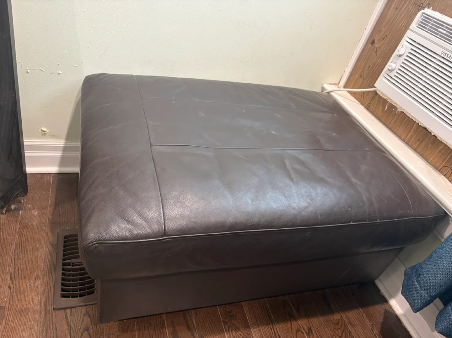 Can be used as extra seating, a footrest, or storage. Neutral dark color that matches any décor. Clean and well-maintained.