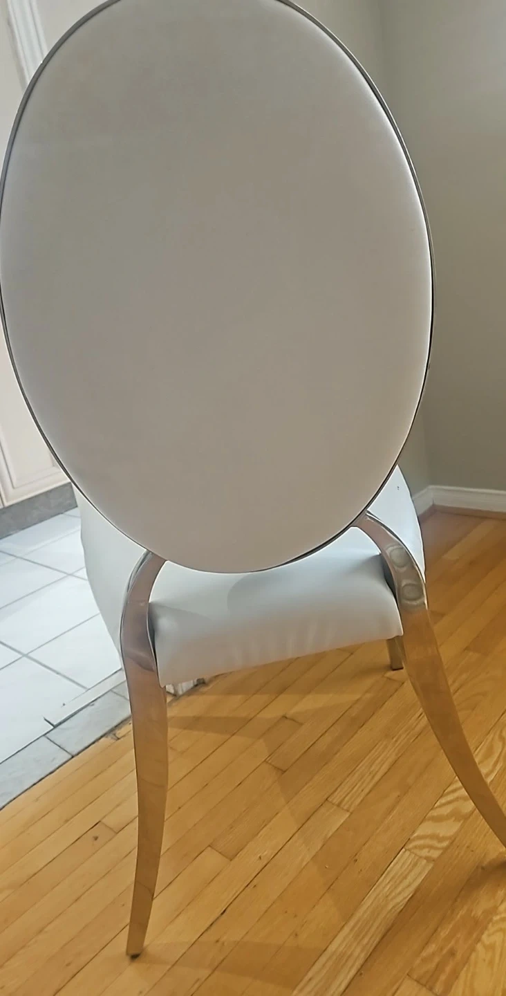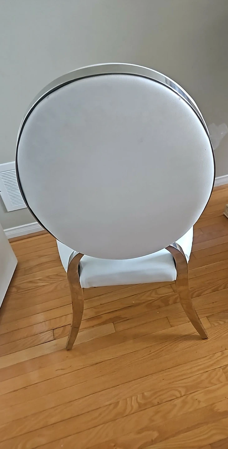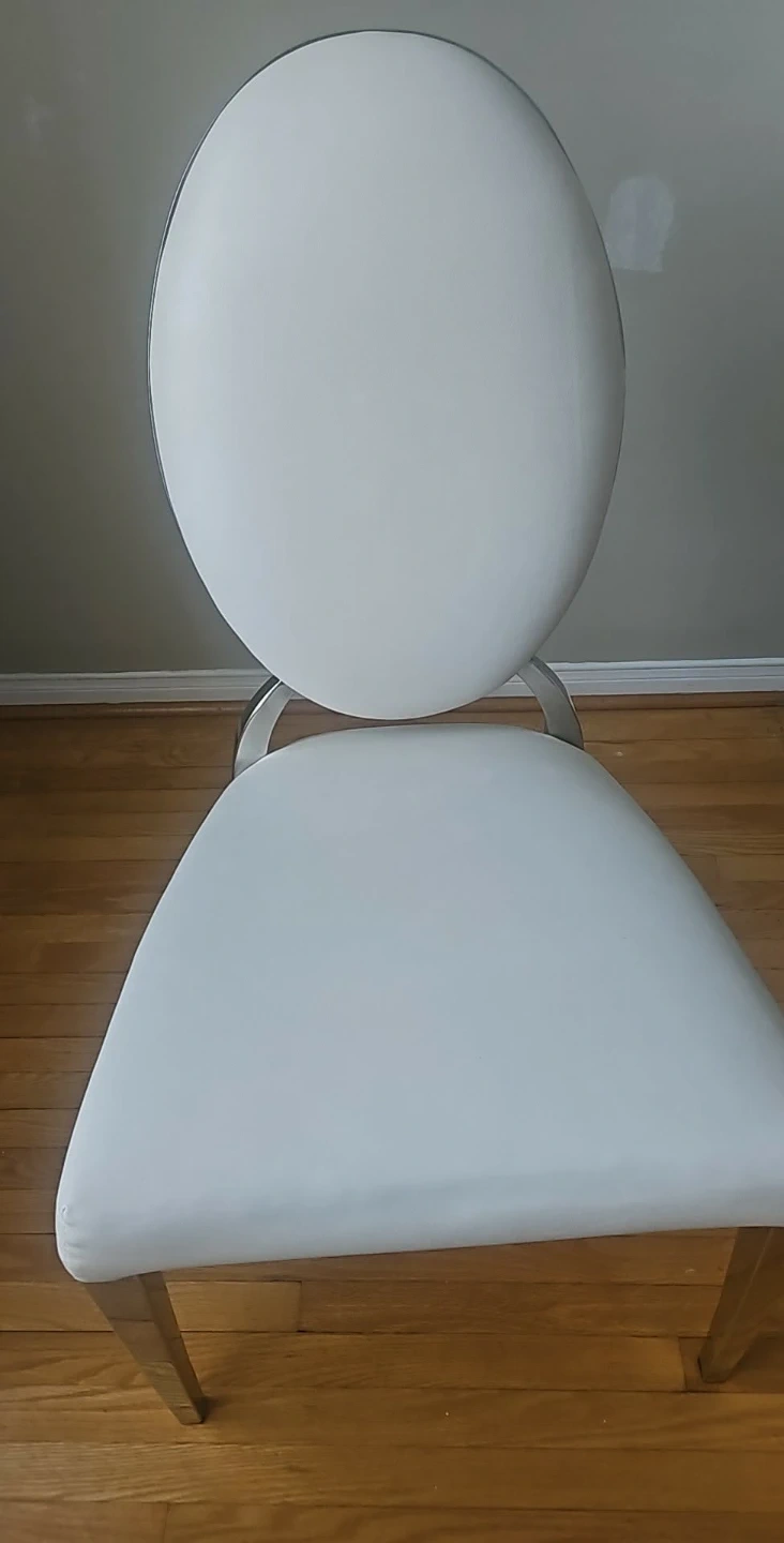 Selling a dining chair with a round back. It's white and has a silver frame. It's in good condition and would look great in any dining room