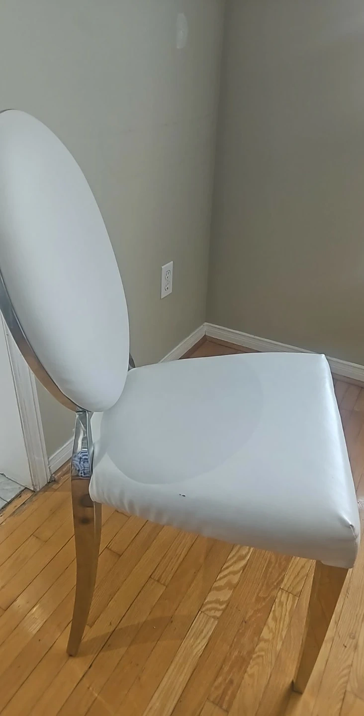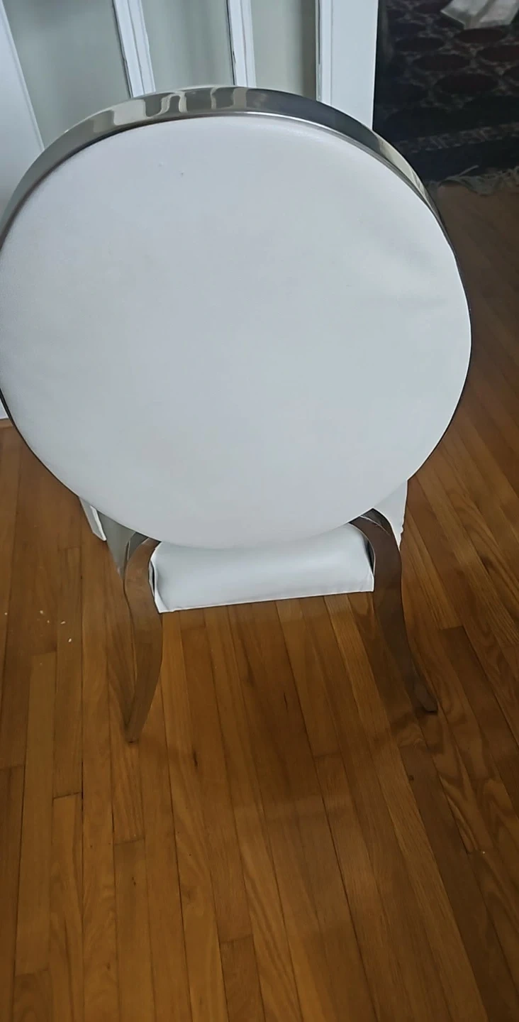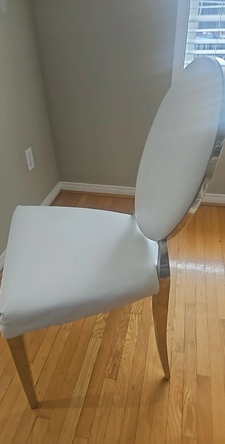 Selling a dining chair with a round back. It's white and has a silver frame. It's in good condition and would look great in any dining room