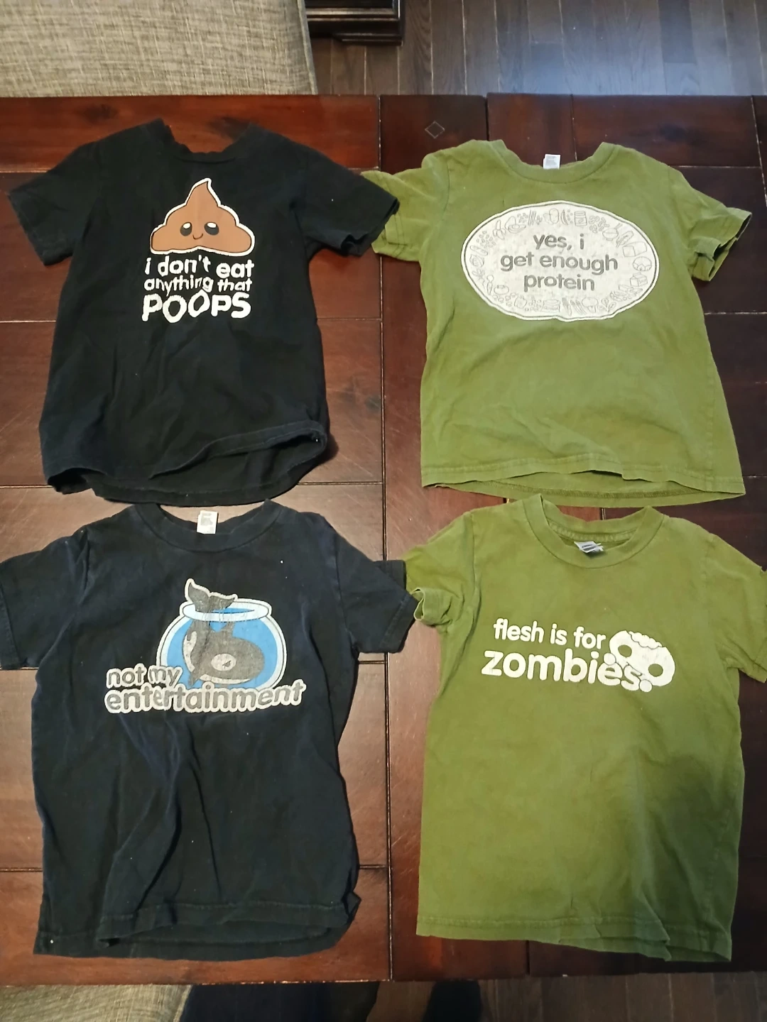 Selling a set of t-shirts (size 4T) with various funny prints. They're in good condition and ready for a new home! There's one that says "yes, I get enough protein", another that says "flesh is for zombies", one with a poop emoji that says "I don't eat anything that POOPS", and another that says "not my entertainment".